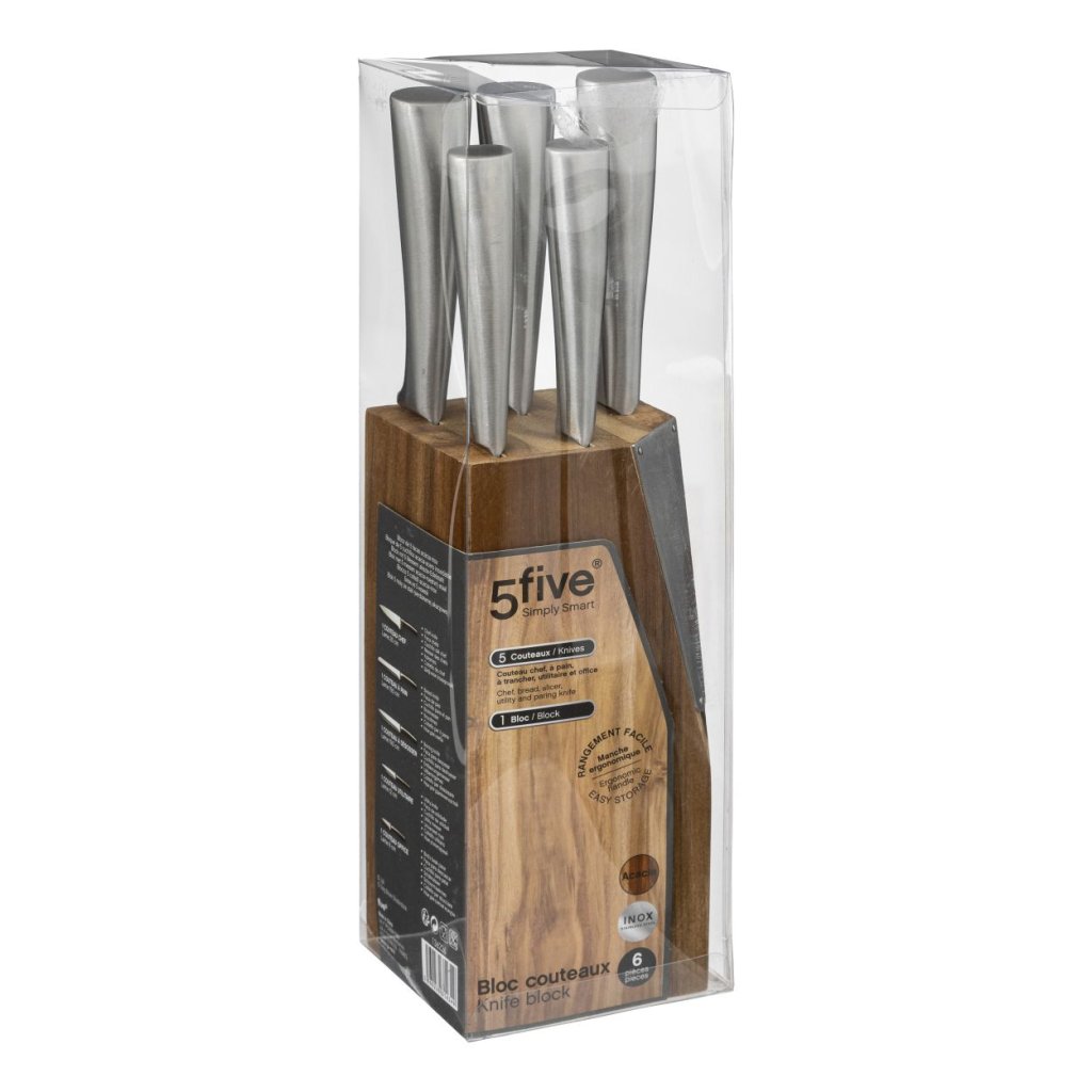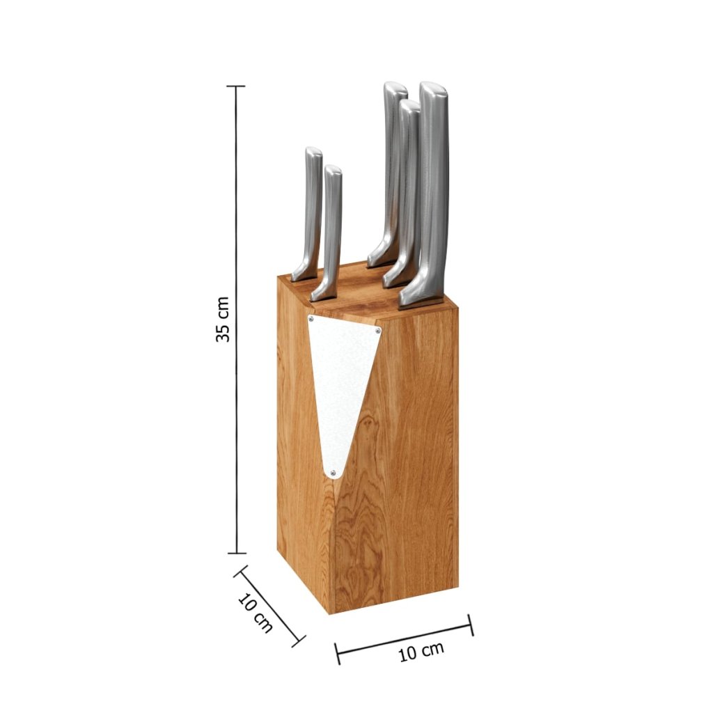 Sada kuchyňských nožů Nilson obsahuje pět nožů z nerezavějící oceli umístěných v elegantním stojanu z akáciového dřeva . Spojení trvanlivých materiálů a minimalistického designu přináší do kuchyně styl, funkčnost a dlouhověkost.