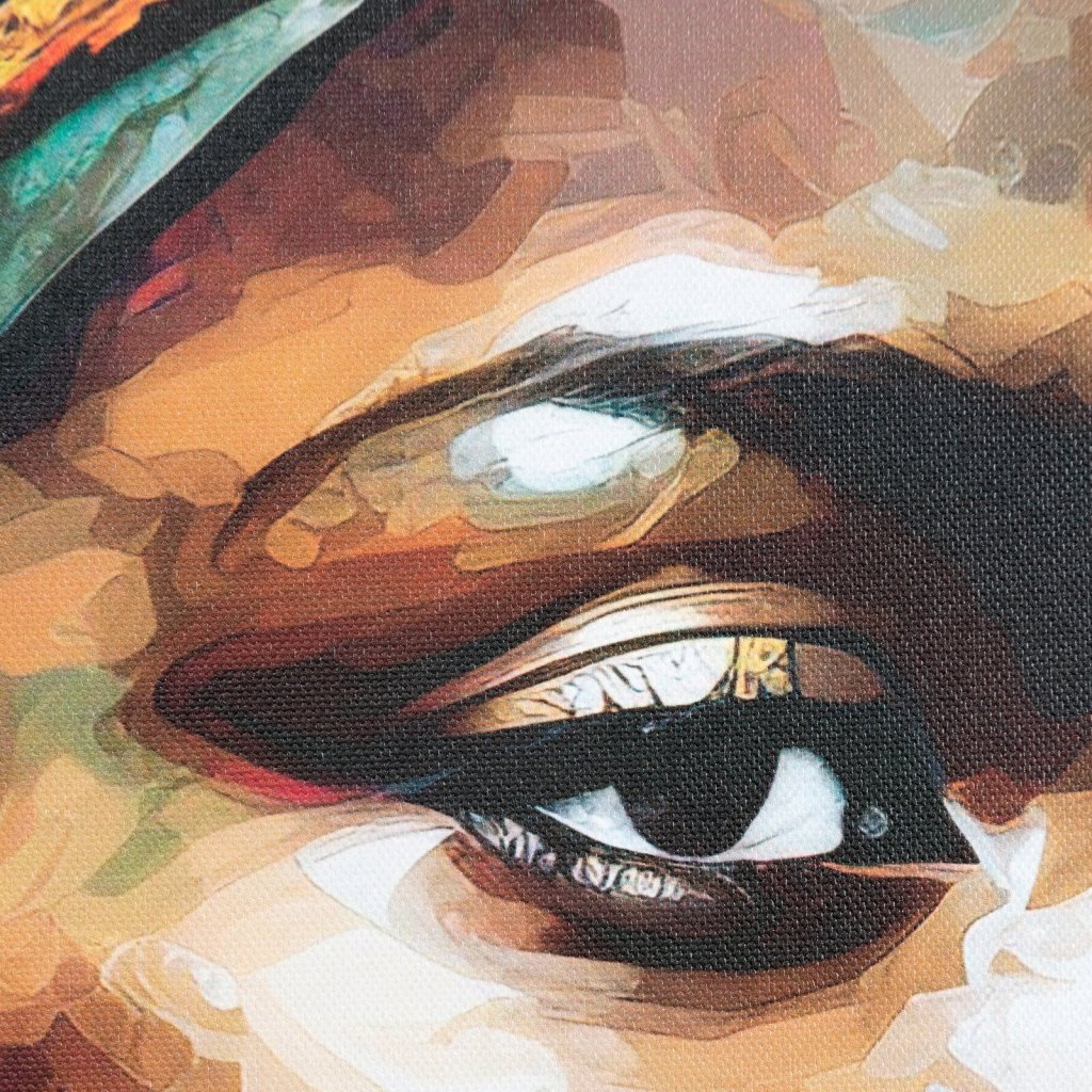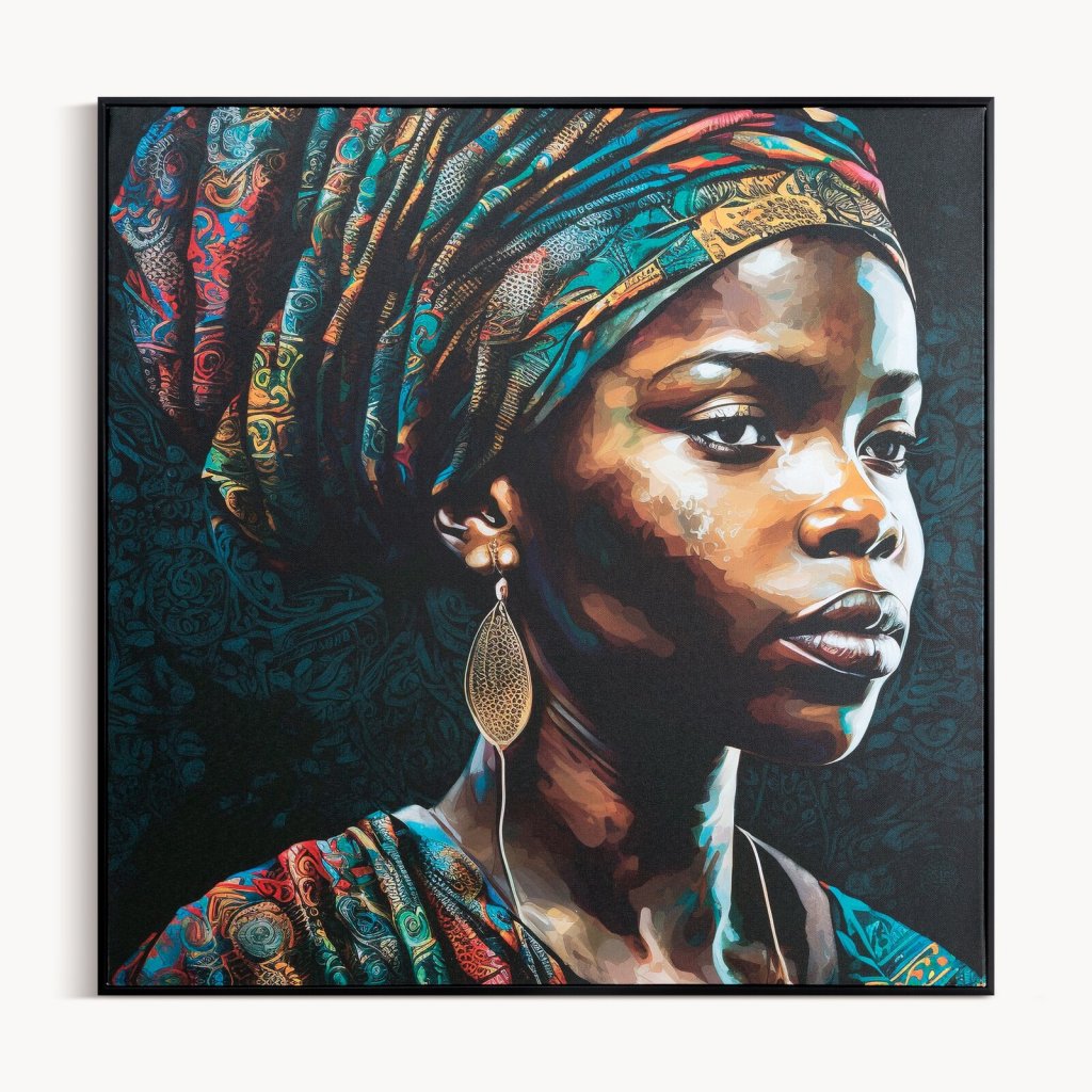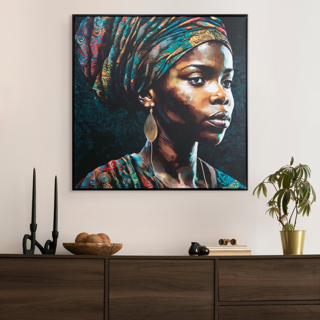Moderní a expresivní obraz vytištěný na plátně, na němž je vyobrazena černoška s barevným turbanem na hlavě. Kontrastní kombinace barev - intenzivní pestrobarevný turban a sytě černé pozadí - dodává celému obrazu výjimečnou eleganci a expresivní sílu. Šířka: 60 cm, výška: 60 cm, barva: vícebarevná, složení: plátno, dřevo, plast.Doplňkové parametry