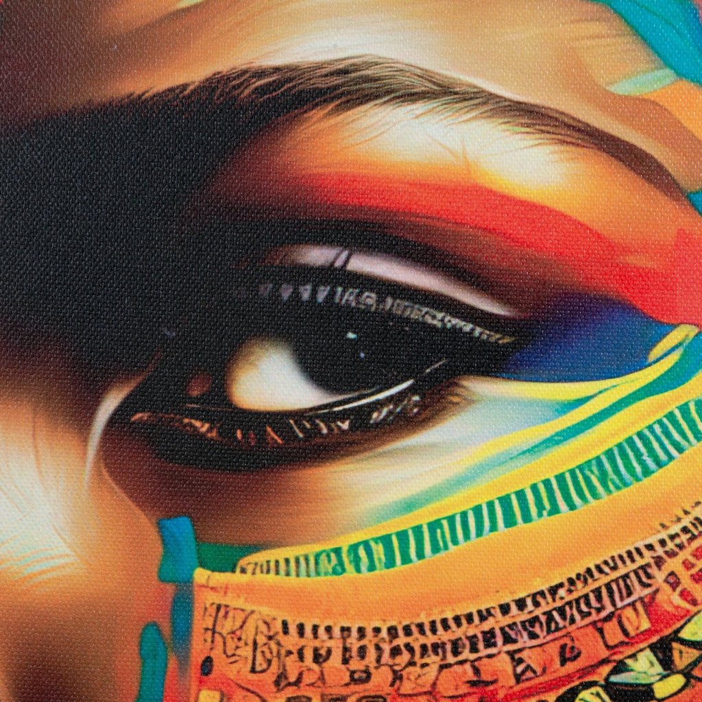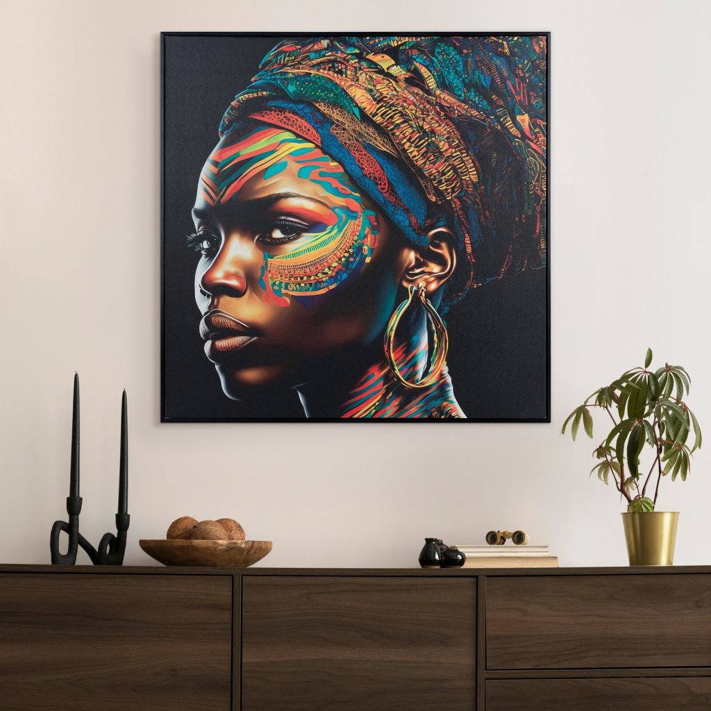 Moderní a expresivní obraz vytištěný na plátně, na němž je vyobrazena černoška s barevným turbanem na hlavě. Kontrastní kombinace barev - intenzivní pestrobarevný turban a sytě černé pozadí - dodává celému obrazu výjimečnou eleganci a expresivní sílu. Šířka: 60 cm, výška: 60 cm, barva: vícebarevná, složení: plátno, dřevo, plast.Doplňkové parametry