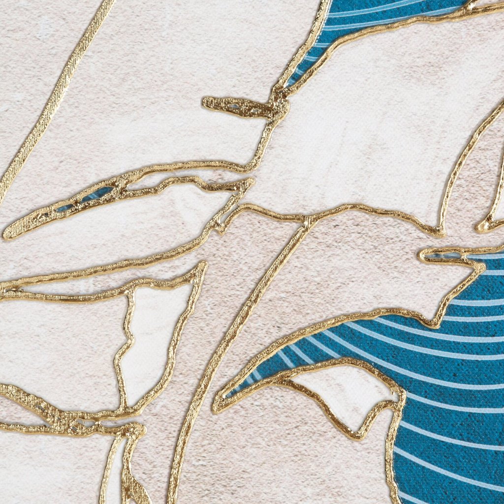 Stylový tisk s velkým motivem banánových listů, který je doplněn zlatými akcenty, jež jemně osvětlují kompozici obrazu. Tropický motiv v elegantním vydání dodává interiéru exotický charakter s nádechem půvabu. Celý obraz je zarámován. Šířka: 50 cm, výška: 70 cm, barva: tyrkysová a zlatá, složení: plátno, dřevo, barva, plast.Doplňkové parametry