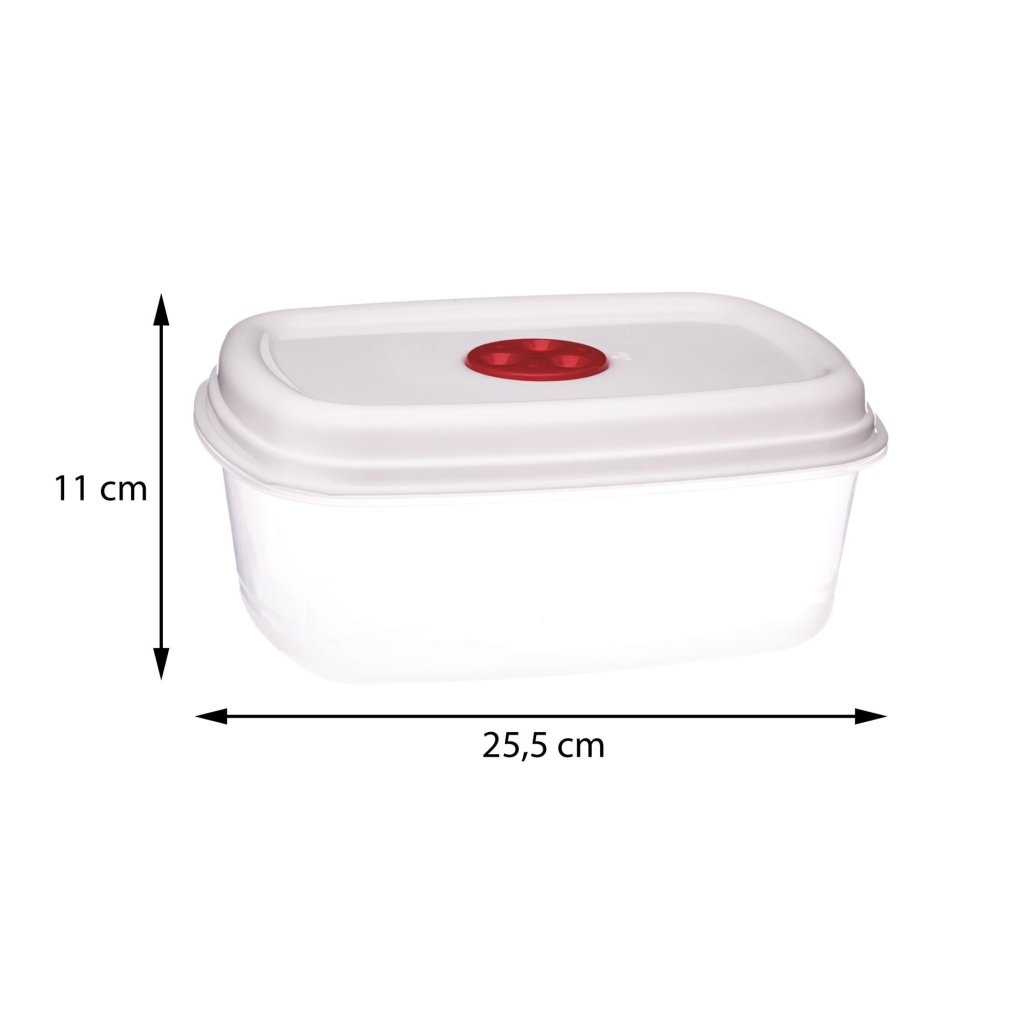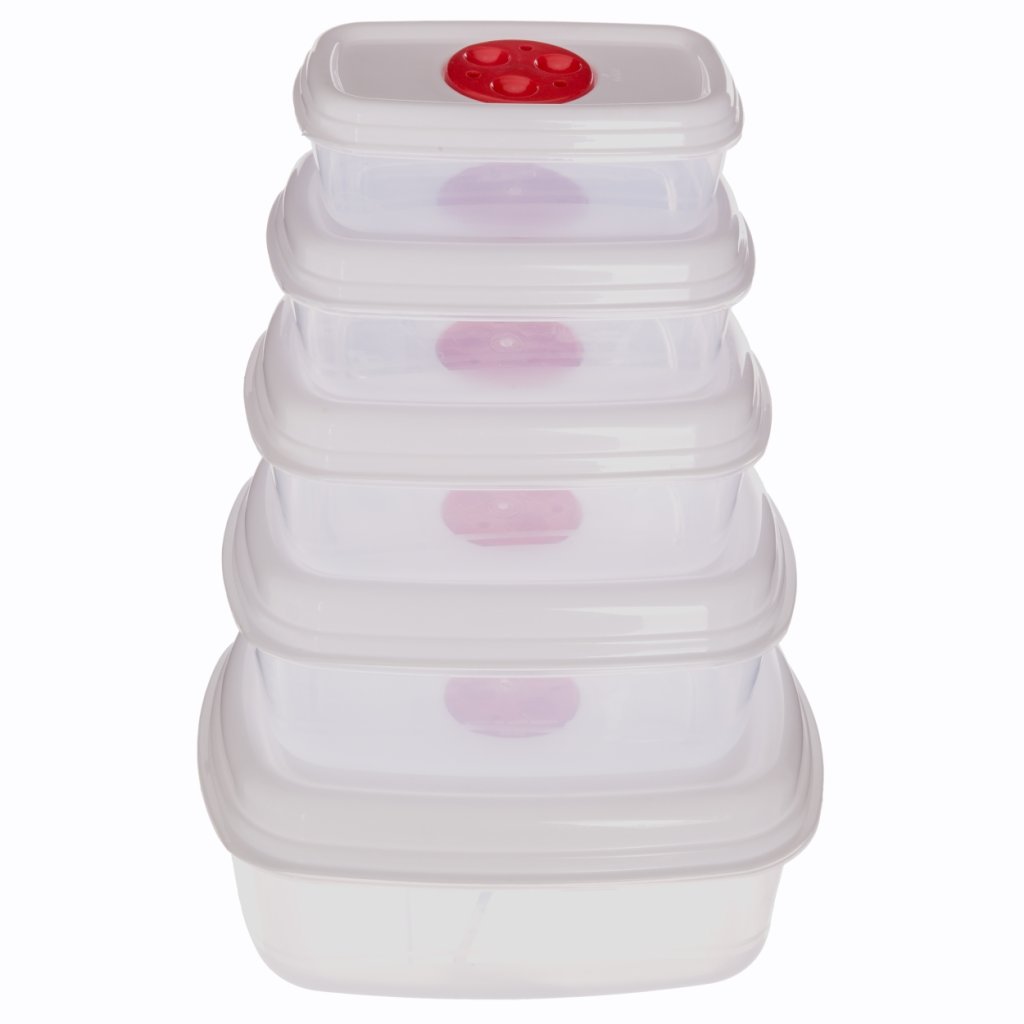 Sada 5 nádob na uskladnění potravin, které jsou ideální pro doma, do práce nebo na cesty. Nádoby na potraviny usnadní i udržování pořádku v chladničce a mrazničce. Lze je použít i jako organizéry. Průhledný materiál umožňuje rychlé prohlížení obsahu bez nutnosti otevírání nádob. Použité materiály neobsahují škodlivé BPA látky, díky čemuž jsou vhodné pro styk s potravinami. Nádoby jsou vhodné pro použití v mikrovlnné troubě a myčce na nádobí, mají speciální ventil ve víku, jsou lehké a esteticky vyrobeny. ml, pro 1800 ml, pro 2850 ml.Doplňkové parametry