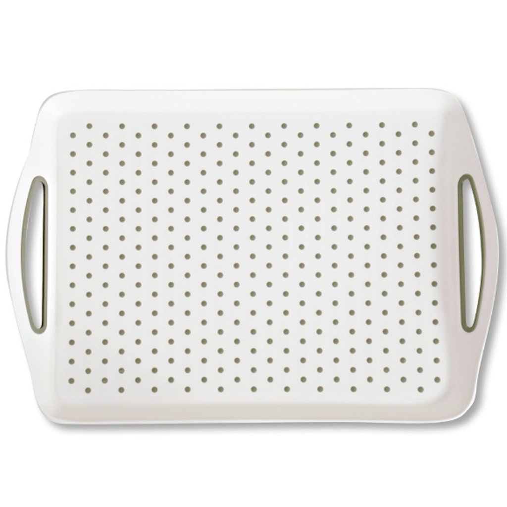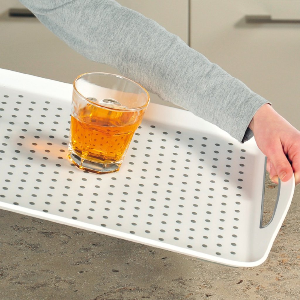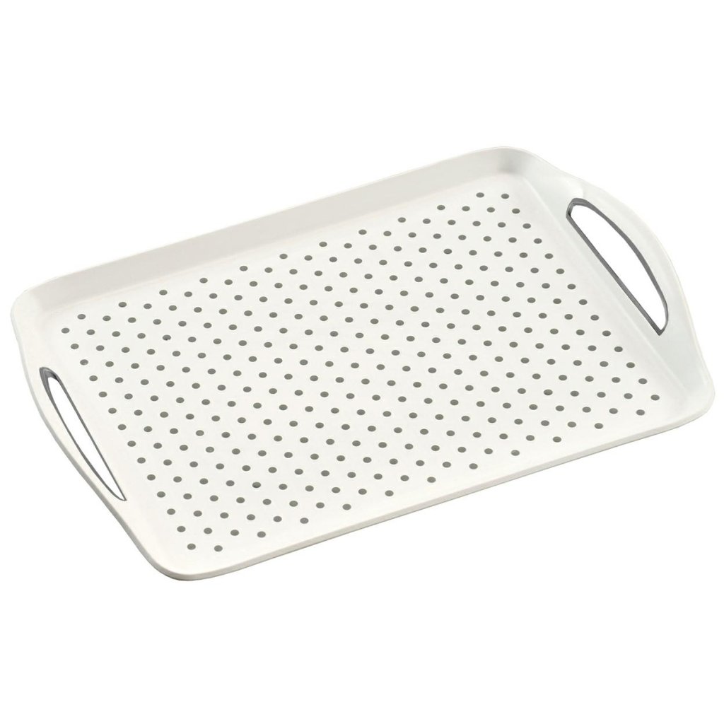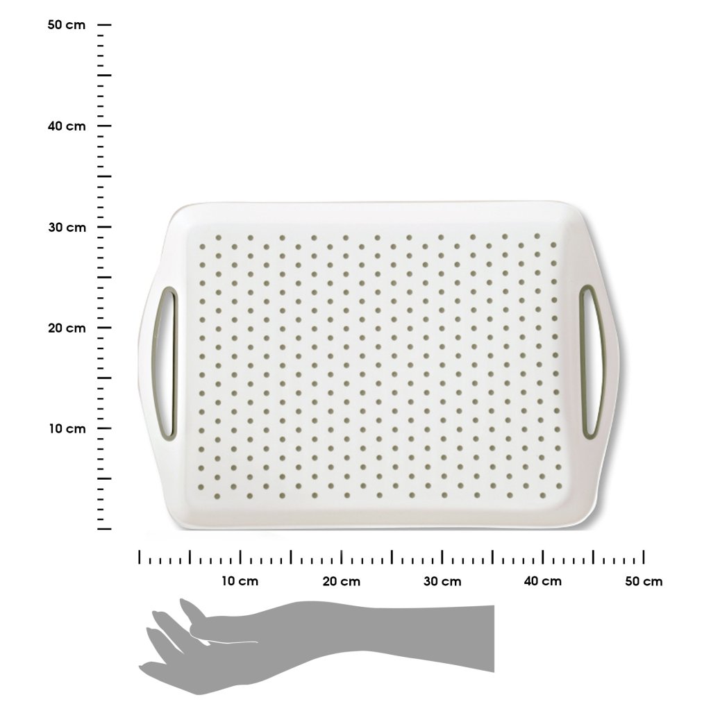 Spolehlivý, praktický a nezbytný podnos s protiskluzovým povrchem a dvěma rukojeťmi na přenášení. Vyrobený z nejkvalitnějšího bílého plastu (polypropylen), potažený protiskluzovým povrchem. Extrémně pevný a lehký. Při správném používání vydrží mnoho let. Díky protiskluzovému povrchu zůstávají předměty umístěné na tácku stabilní při přesouvání, čímž se minimalizuje riziko náhodného posunutí nebo převrácení.Doplňkové parametry