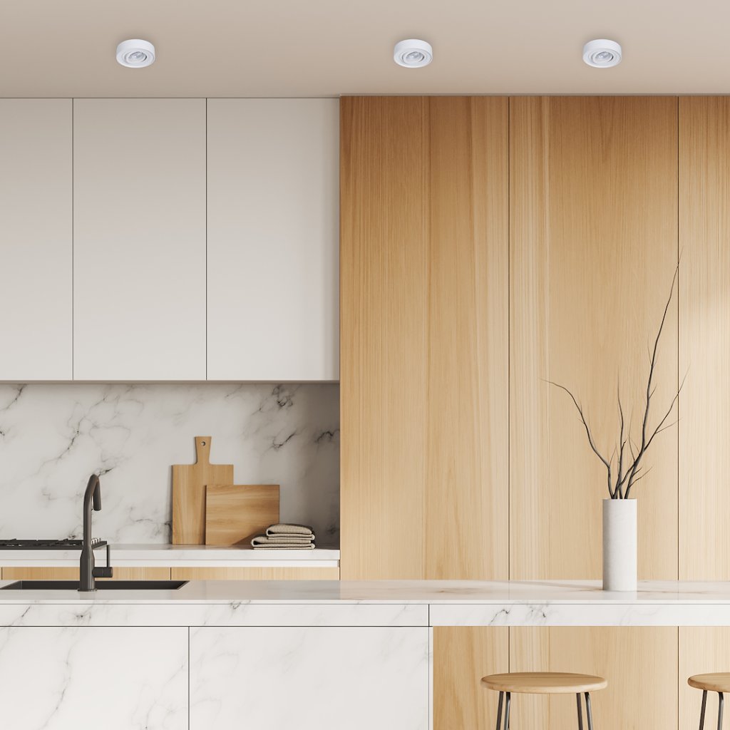 Svítilna má kompaktní rozměry – šířku a hloubku 97 mm a výšku pouhých 50 mm, což umožňuje vytvářet designově jednotné rozložení světelných bodů i v menších místnostech. Neutrální bílá barva a minimalistický kulatý tvar perfektně zapadnou do moderních interiérů, přičemž se snadno sloučí se stropem i stávajícím zařízením.