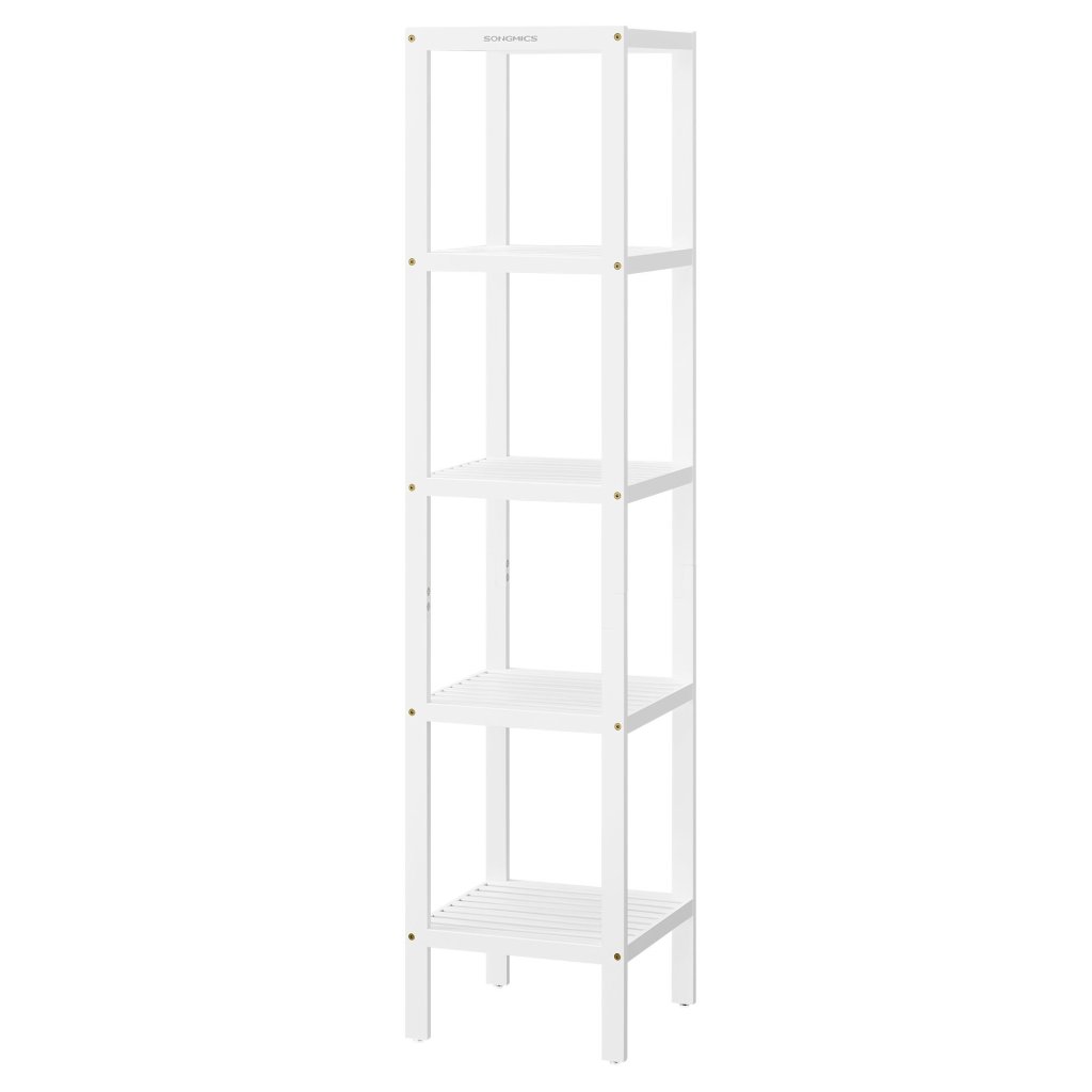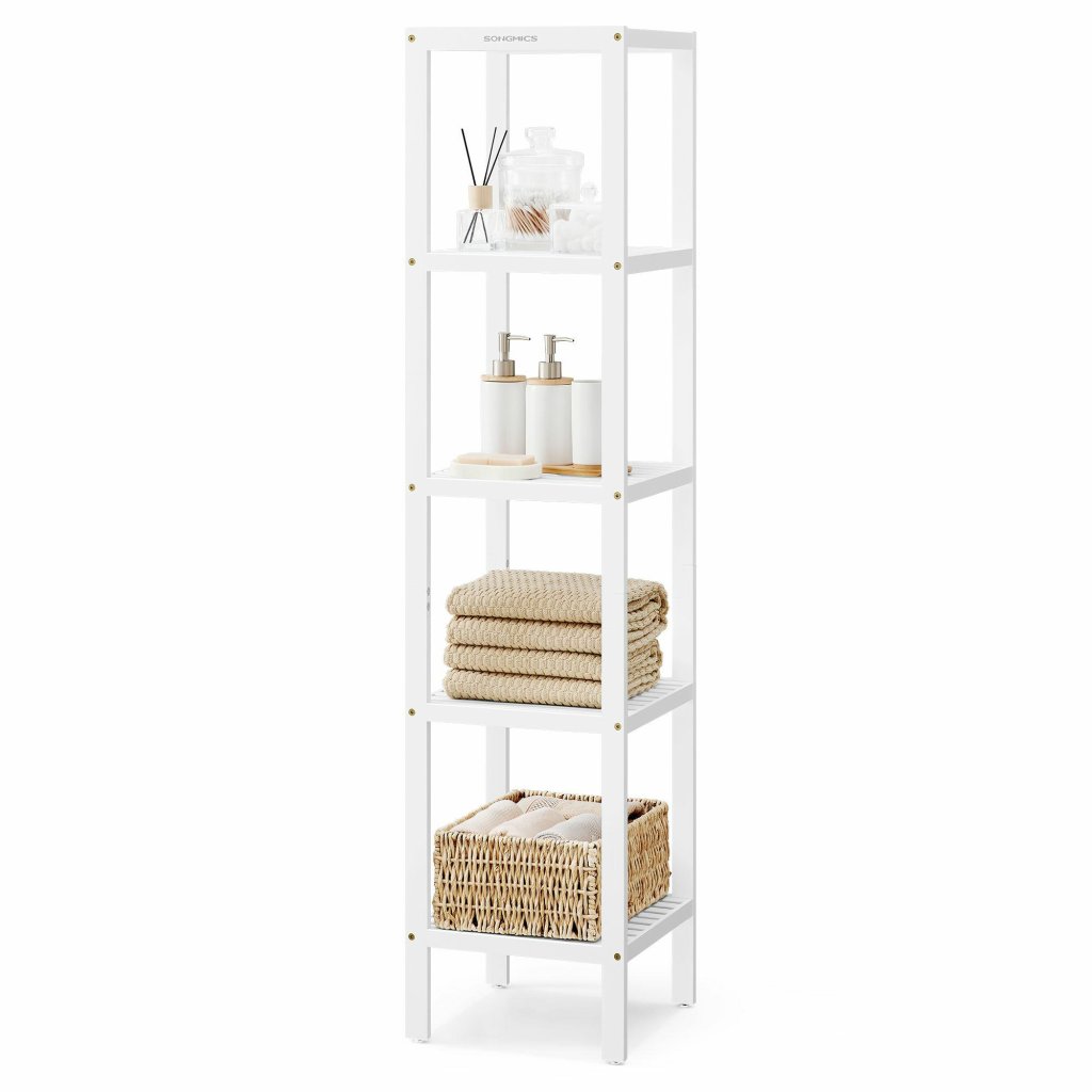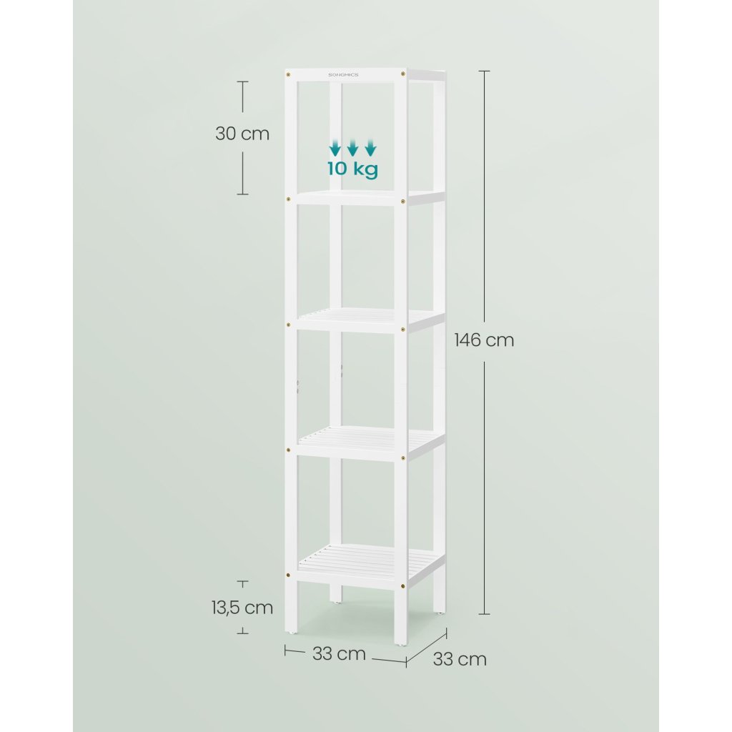 Úzká, pětiúrovňová konstrukce se snadno vejde i do menších místností a poskytne dostatek úložného prostoru pro kosmetiku, ručníky, koření, knihy nebo rostliny .