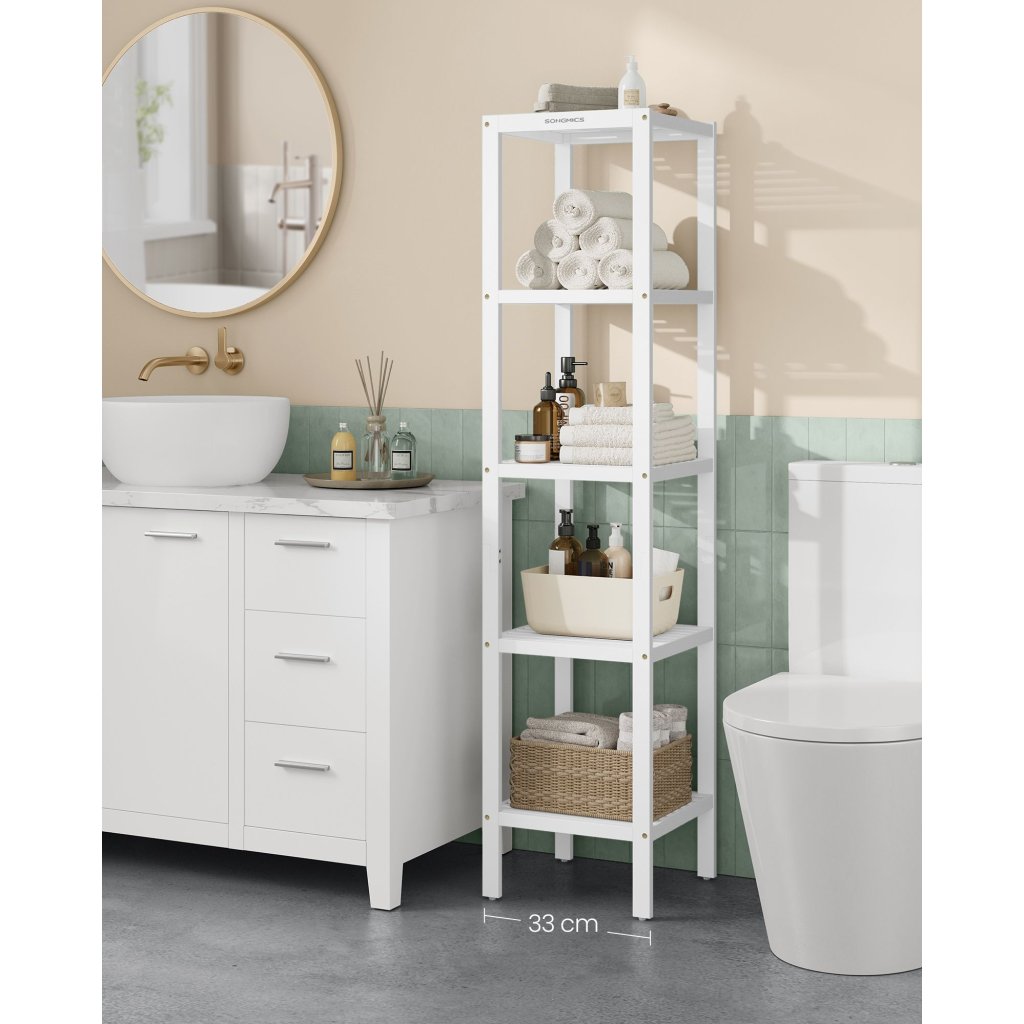 Univerzální bílý design se hodí nejen do koupelny, ale také do kuchyně, obývacího pokoje či na balkon. Spojení funkčnosti a přírodního vzhledu bambusu vytváří harmonický doplněk, který usnadní organizaci a elegantně vystaví vaše oblíbené předměty.