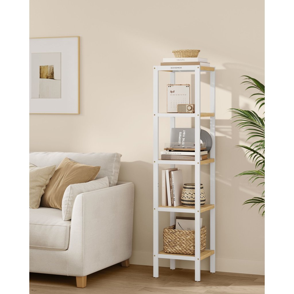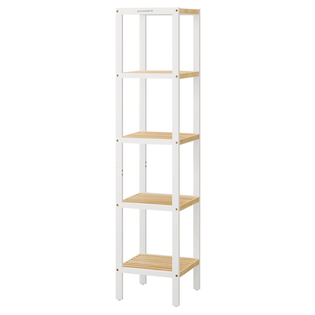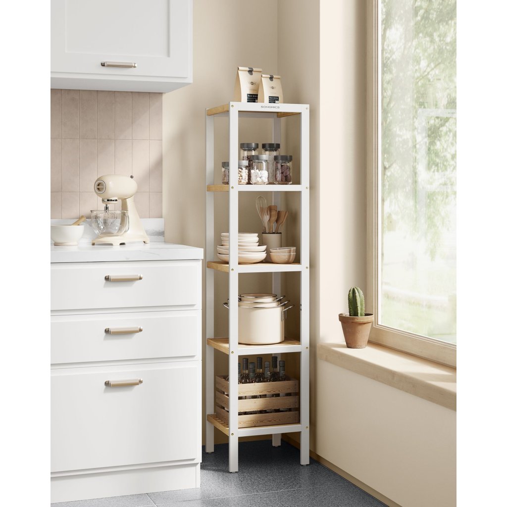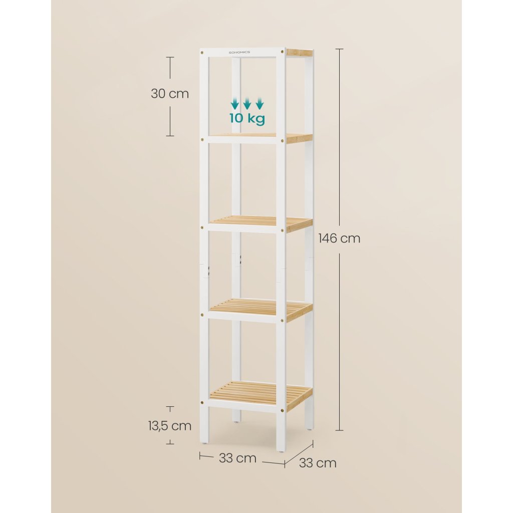 Kombinace bílého rámu a hnědých polic z přírodního bambusu vnáší do interiéru teplo, eleganci a přírodní vzhled . Pevná konstrukce zaručuje stabilitu a dlouhou životnost .