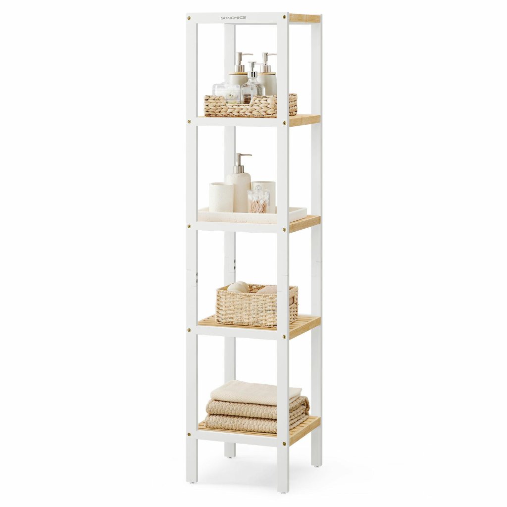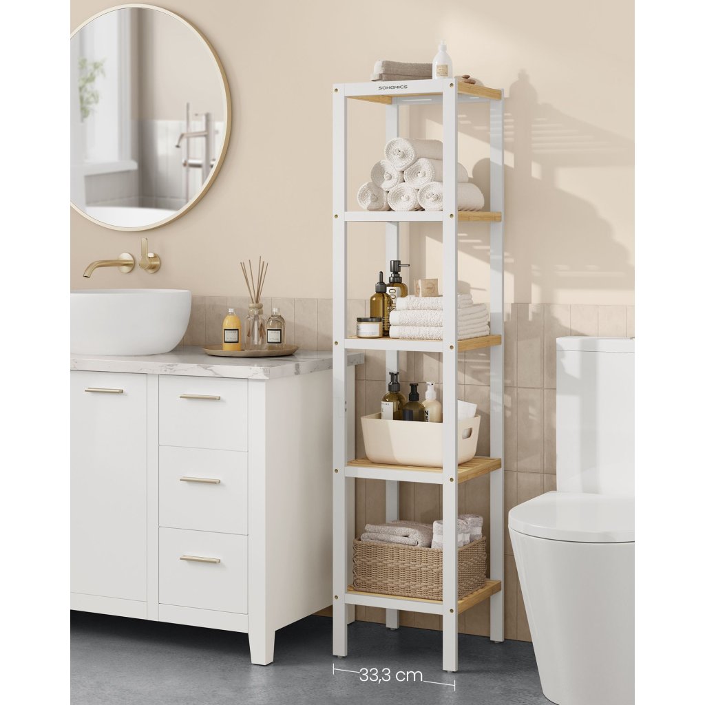 Polička do koupelny Desmond je úzká, 5-úrovňová bambusová police , která nabízí praktické a stylové řešení pro efektivní využití vertikálního prostoru, čímž šetří místo na podlaze. Ideální do koupelny na uložení ručníků, kosmetiky a doplňků , do kuchyně jako organizér na koření a nádobí , nebo do obývacího pokoje na dekorace či rostliny .