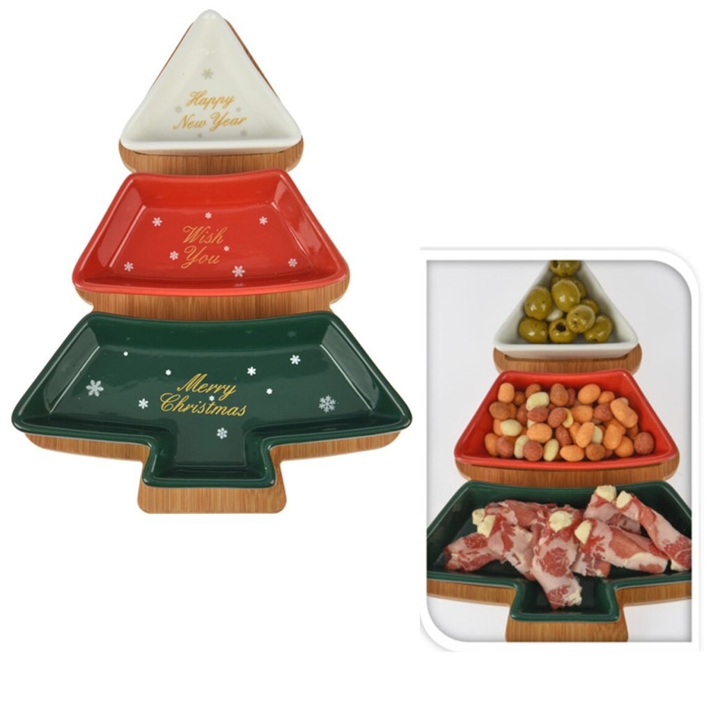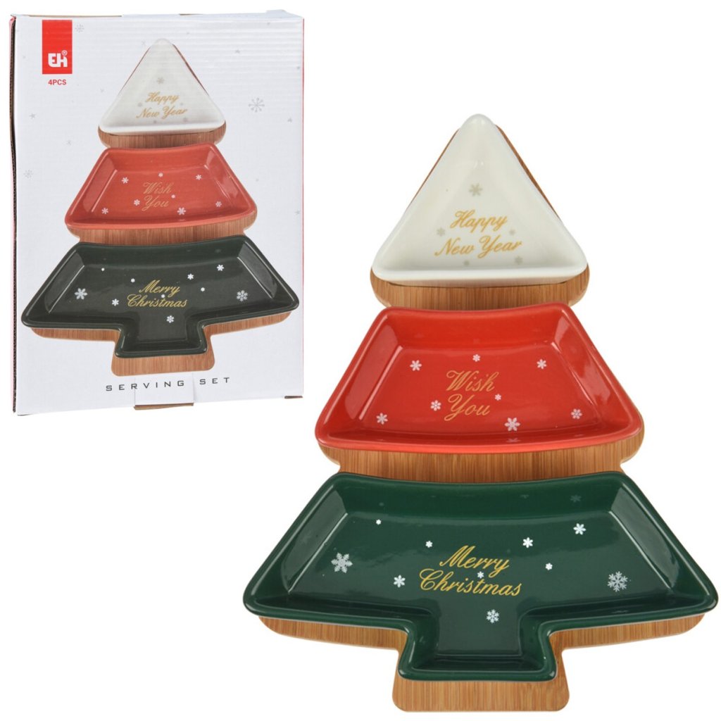 Přineste vánoční kouzlo na váš stůl se sadou na servírování ve tvaru vánočního stromku. Tato elegantní a funkční sada se skládá ze tří porcelánových misek v různých barvách s vánočními nápisy a podnosu z přírodního dřeva, který dodává celku stylový charakter. Ideální pro podávání svátečního občerstvení, sladkostí, koláčků nebo ovoce. Perfektní i jako dekorace na stůl, zdůrazňující sváteční atmosféru.Doplňkové parametry