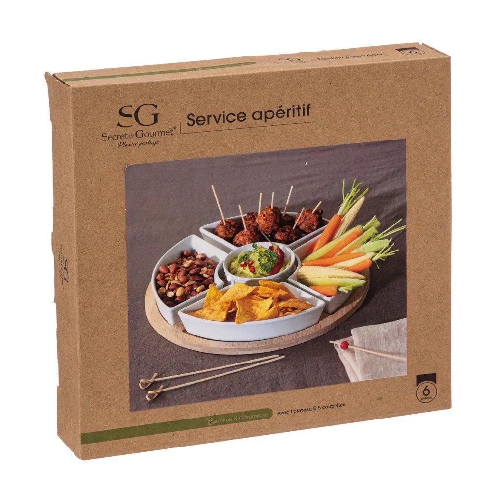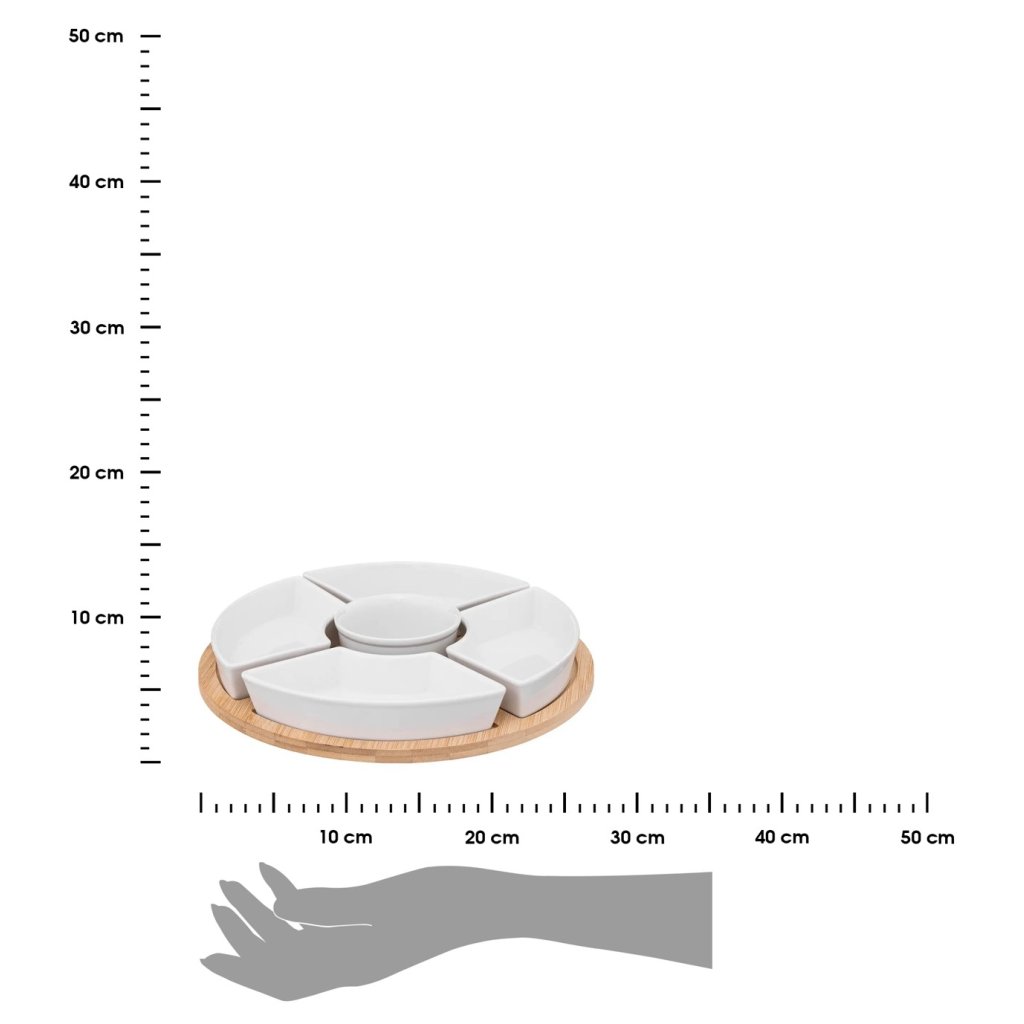 Souprava občerstvení, která osloví každého, kdo oceňuje praktičnost a funkčnost, ale také estetiku na stole a v kuchyni. Používá se při podávání různých druhů příloh, občerstvení a omáček. Souprava se skládá z pěti porcelánových misek a bambusového podstavce. Bílá barva sklenic ladí s dřevěným stojanem a vytváří tak stylový celek, který působí velmi elegantně a vyniká jednoduchým designem. Souprava je ideální pro společenská setkání a je krásným doplňkem k nádobí. Vhodné do myčky nádobí (neplatí pro podnos). Lze použít v mikrovlnné troubě (neplatí pro podnos).Doplňkové parametry