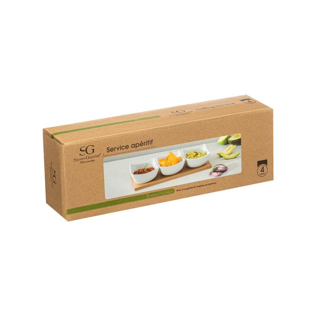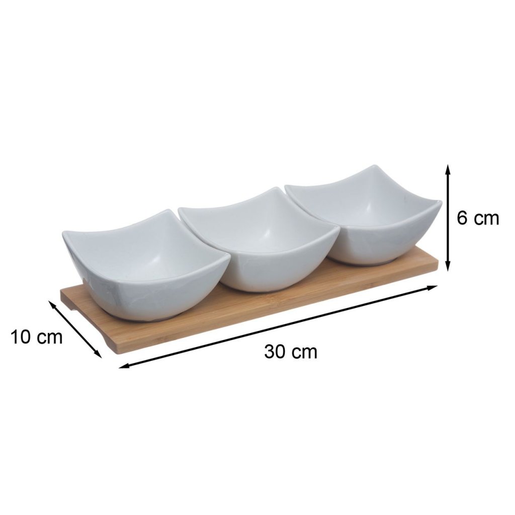 Souprava pro servírování občerstvení, která osloví každého, kdo oceňuje praktičnost a funkčnost, ale také estetiku na stole a v kuchyni. Dá se použít k podávání různých druhů příloh, občerstvení a omáček. Souprava sestává ze tří porcelánových misek a bambusového podnosu. Vhodné do myčky nádobí (neplatí pro podnos). Lze použít v mikrovlnné troubě (neplatí pro podnos).Rozměry misky: 9,7x9,7x5 cm