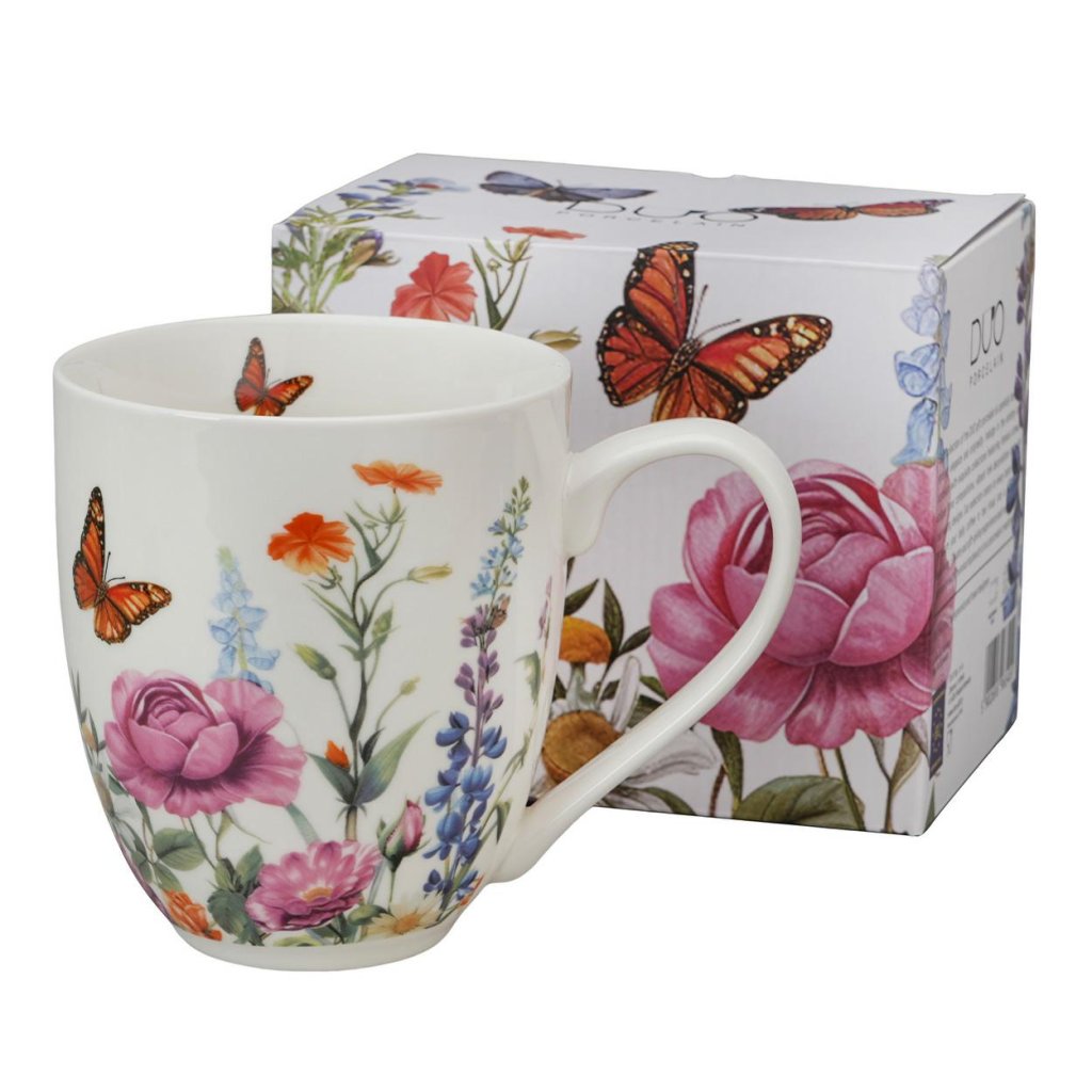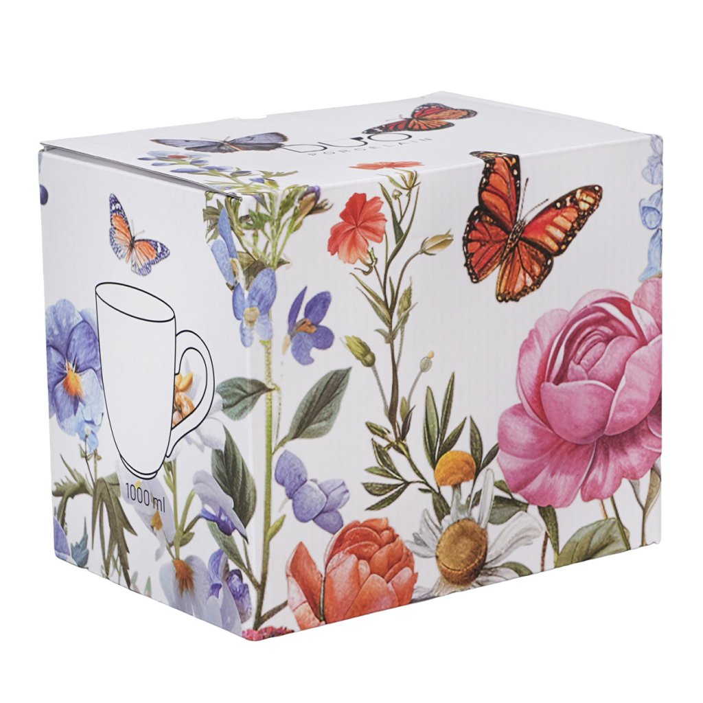 Porcelánový hrnek XXL Summer o objemu 1000 ml je jako stvořený pro všechny, kteří si rádi vychutnávají své nápoje stylově as dávkou letní energie. Povrch hrníčku zdobí barevný motiv plný rozkvetlých květů a motýlů , který navozuje dobrou náladu a připomíná krásy přírody.