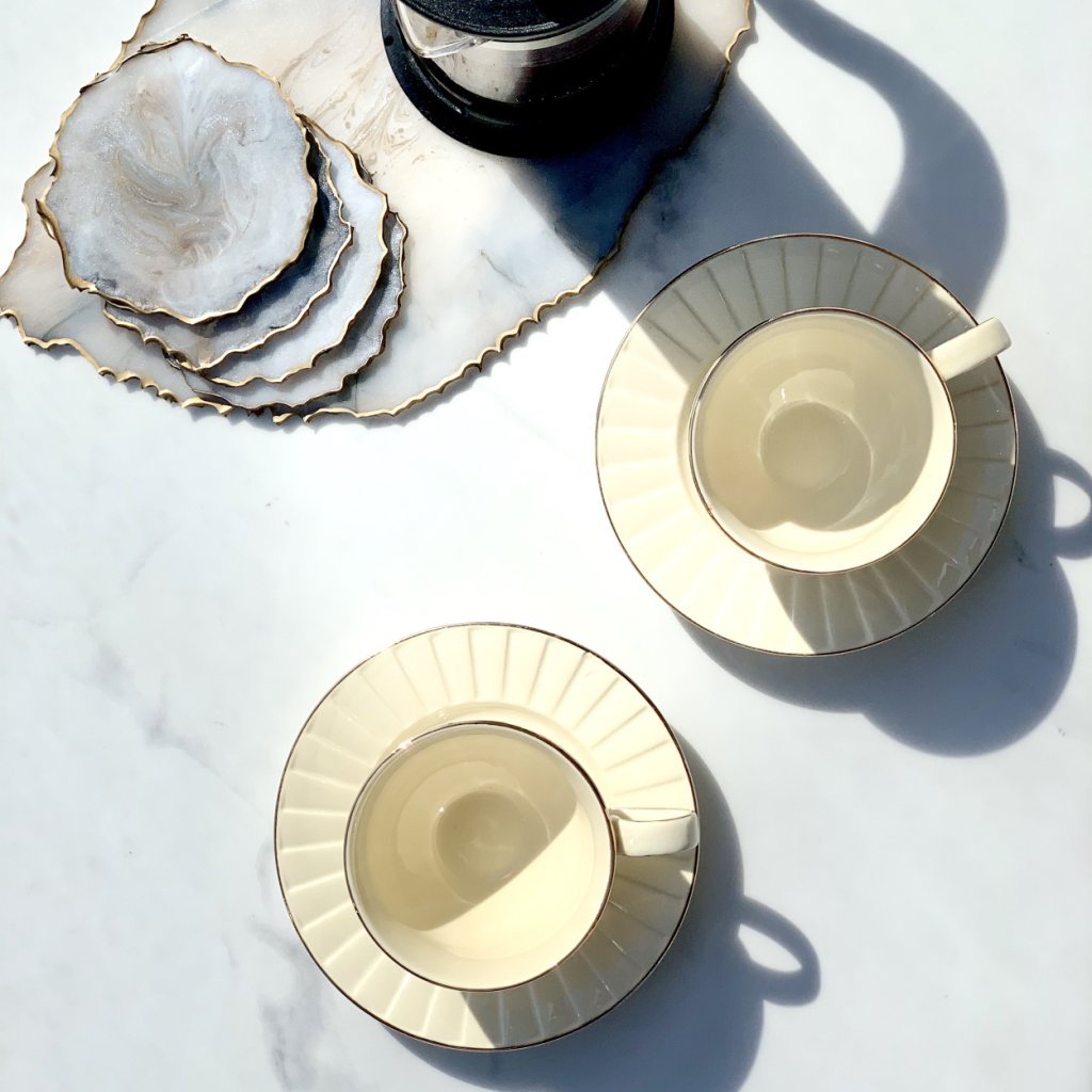 Každý šálek je vyroben z porcelánu typu New Bone China , který se vyznačuje lehkostí, odolností a charakteristickým jemným leskem. Klasicistické žlábkování a precizní tvarování podtrhují celkový estetický dojem a vytvářejí harmonický doplněk každého slavnostního nebo každodenního stolování.