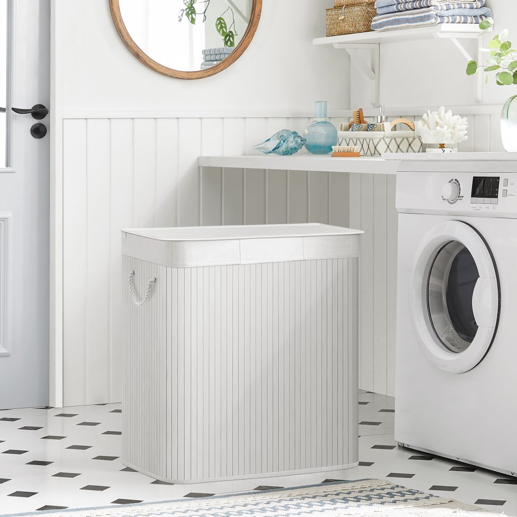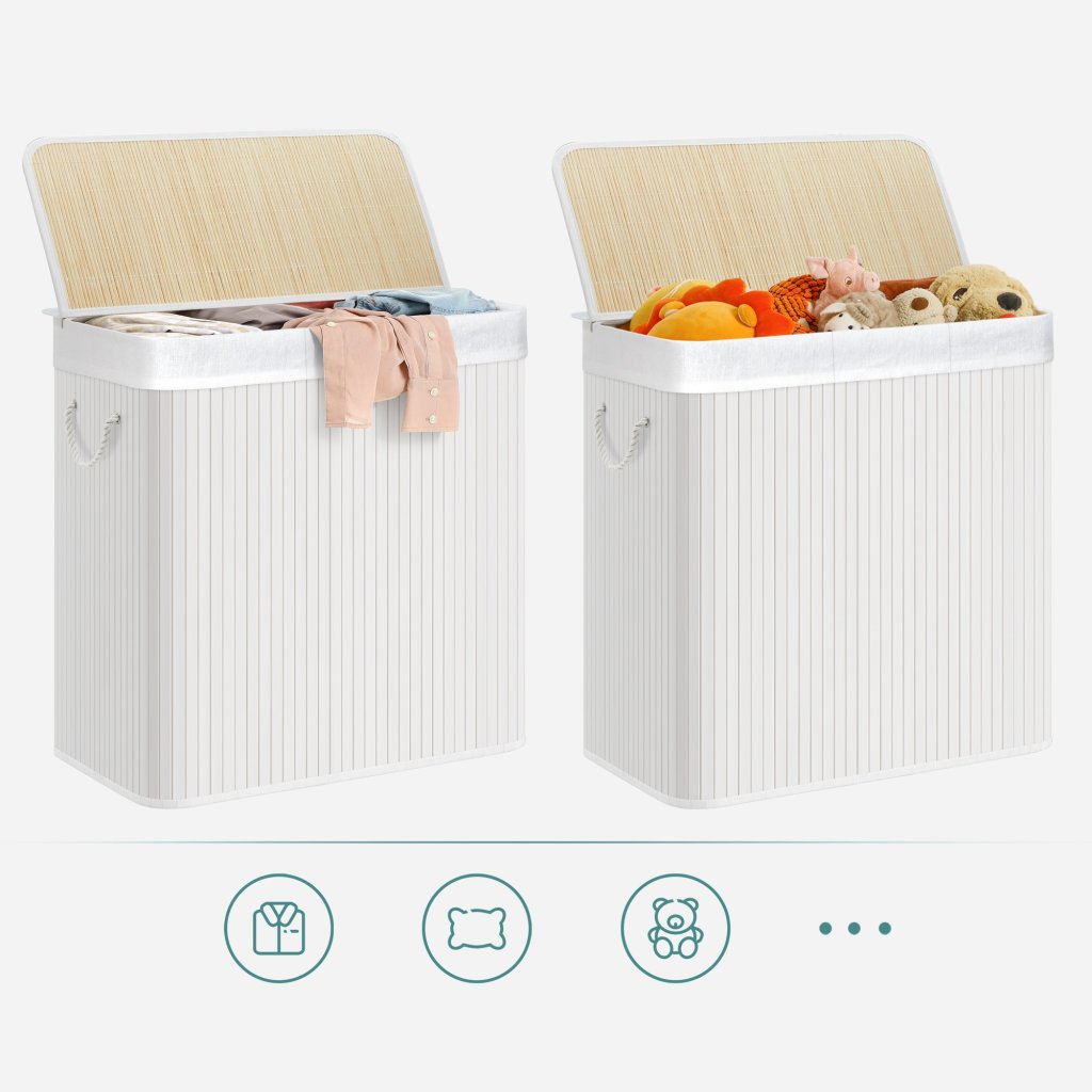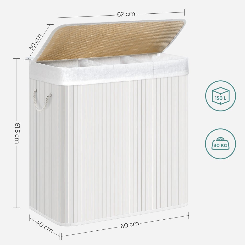 Díky objemu 150 litrů a nosnosti až 25 kg poskytuje dostatek prostoru i pro vícečlennou domácnost. Odnímatelné vnitřní kapsy z bavlny jsou pratelné a udržují hygienu bez námahy. Konstrukce z odolného bambusového dřeva zajišťuje stabilitu a dlouhou životnost. Díky přírodnímu vzhledu a univerzálnímu designu se hodí nejen do koupelny či prádelny, ale také do ložnice, dětského pokoje nebo obývacího pokoje – například jako organizér na hračky nebo textilie.