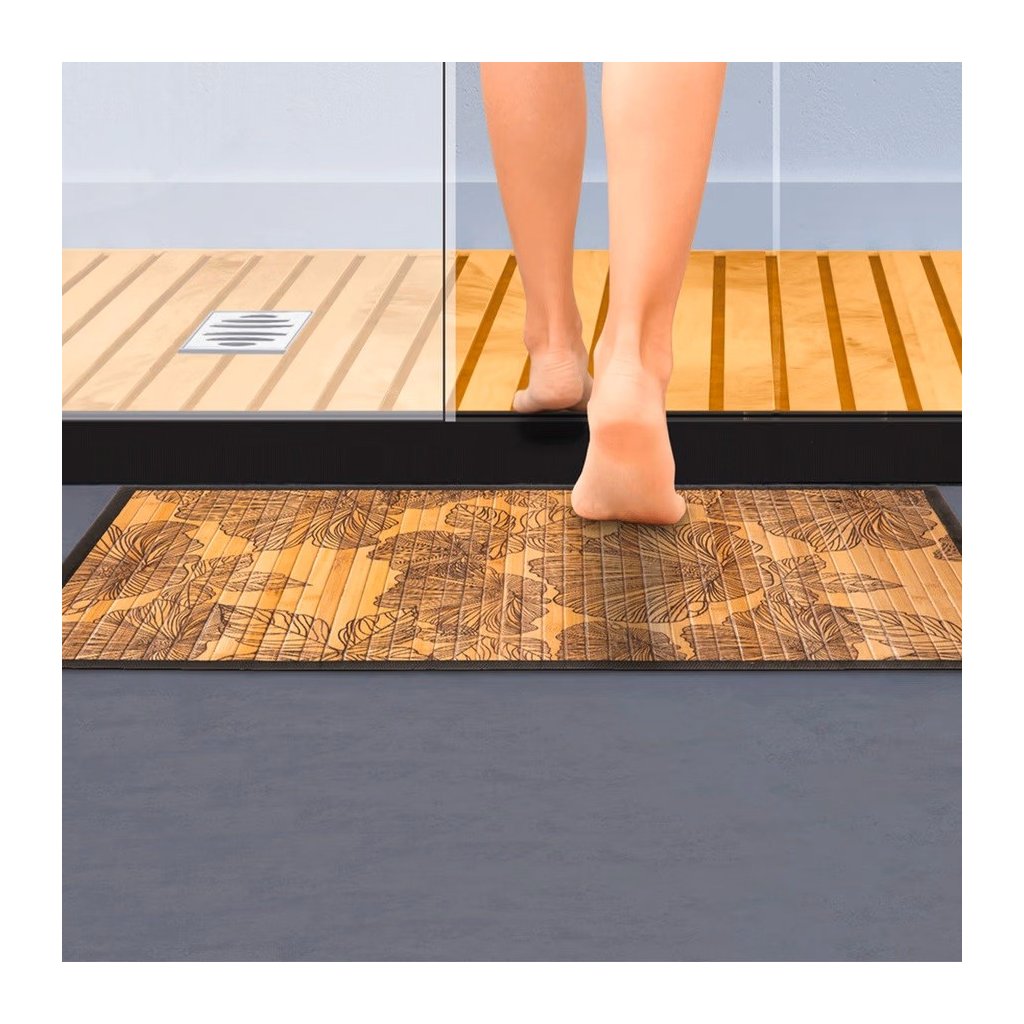 Předložka do koupelny Blackflower o rozměrech 50 × 80 cm je vyrobena z pevných bambusových lamel a zdobená jemným květinovým motivem , který vnáší do koupelny přirozenou eleganci a dekorativní akcent.