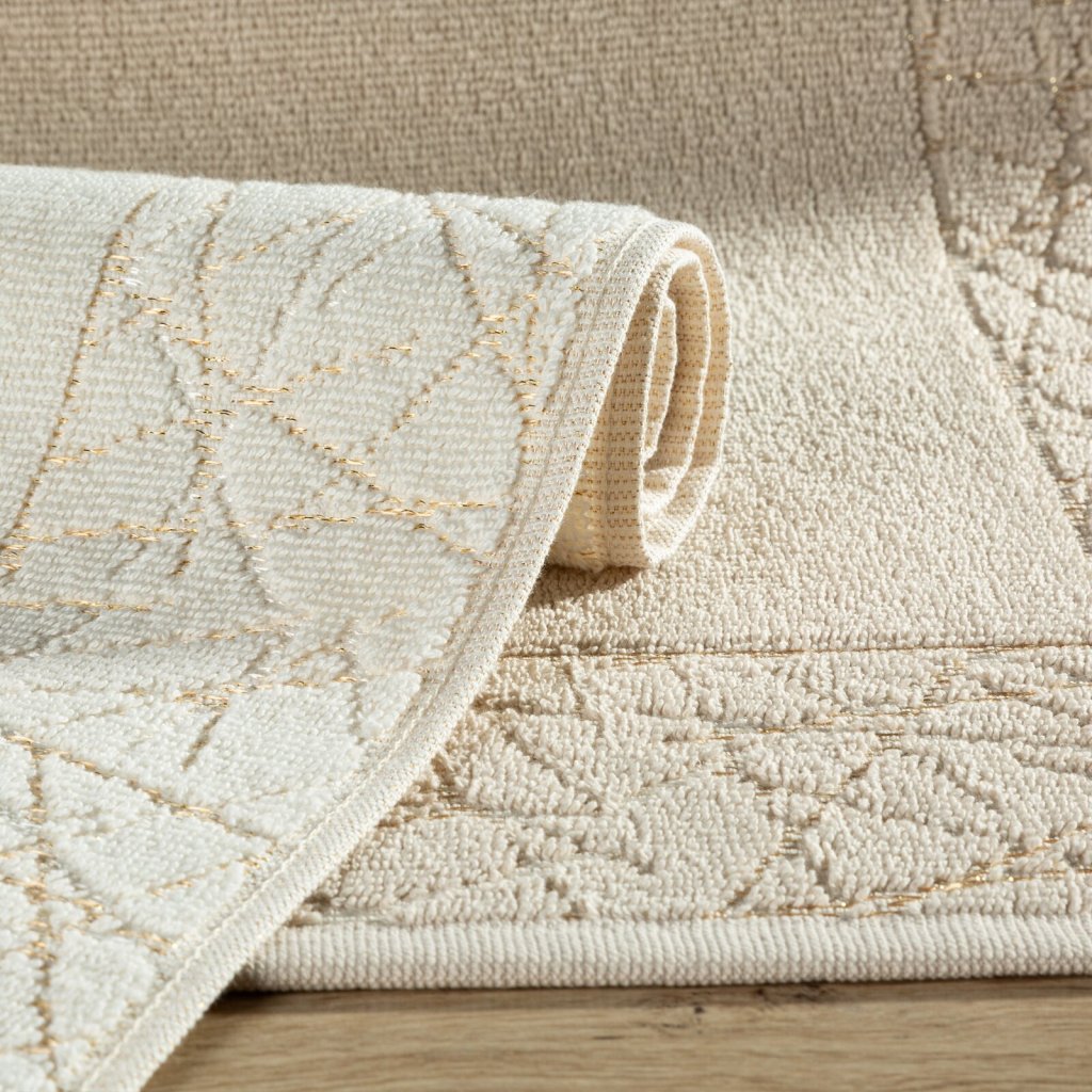 Koupelnová předložka, šířka: 50 cm, délka: 70 cm, barva: krémová, hmotnost: 700 GSM, složení: 100% bavlna; dekorativní část: 85% bavlna, 15% polyester.Doplňkové parametry