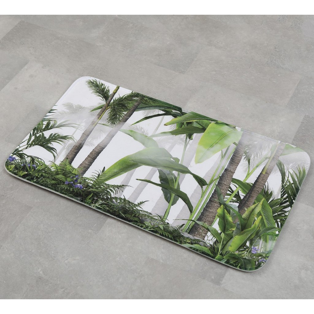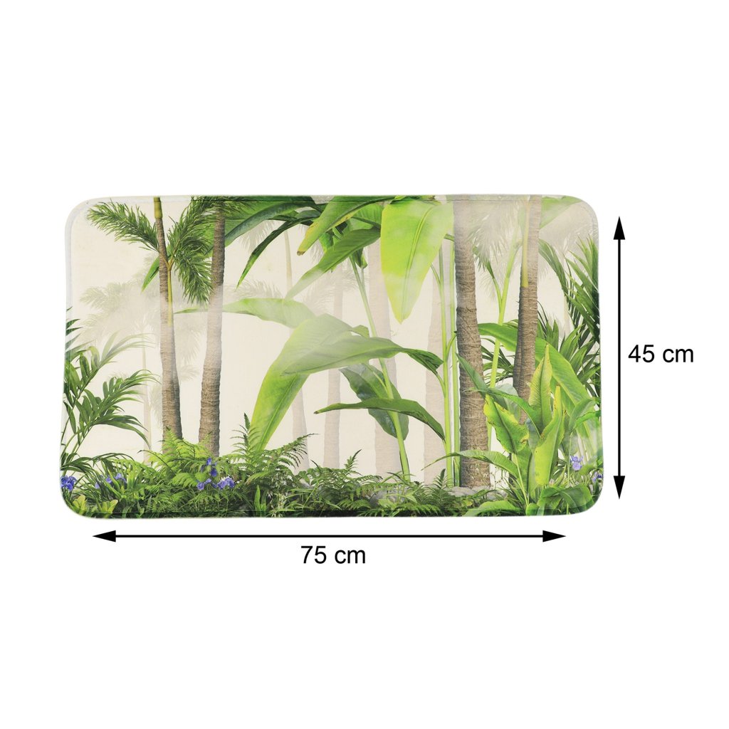 Předložka do koupelny Oasis o rozměrech 45 × 75 cm přinese do tvé koupelny osvěžující tropický nádech . Motiv bujné zeleně, palmových listů a exotické vegetace vytváří vizuálně příjemnou atmosféru a přemění každodenní rutinu na chvilku odpočinku v přírodním prostředí.