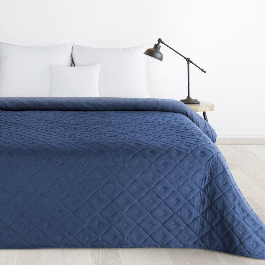 Jednobarevný přehoz na postel vyrobený technikou hot press, šířka: 200 cm, délka: 220 cm, barva: tmavě modrá, hmotnost: 85 GSM, složení: 100% polyester.Doplňkové parametry