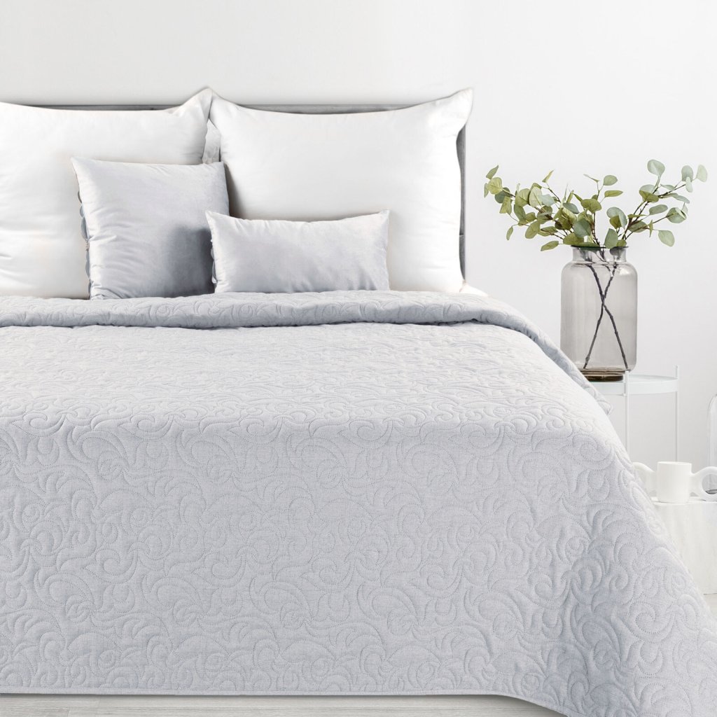 Přehoz na postel se zajímavým prošívaným vzorem, šířka: 170 cm, délka: 210 cm, barva: stříbrná, hmotnost: 185+120+70 GSM, složení: 100% polyester.Doplňkové parametry