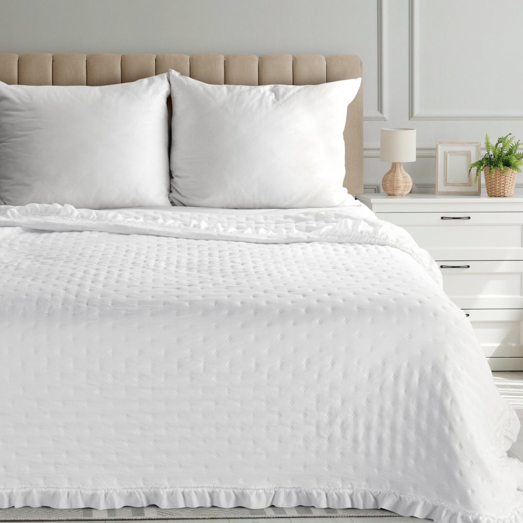 Tkanina měkká na dotek je prošívaná technikou lisování za tepla, která zajišťuje odolný vzor a delší životnost materiálu. Neobvyklý dekor volánků dodá vaší ložnici romantický styl. Lehká a pružná výplň znamená, že přehoz při stlaní postele měkce zakryje postel, a zajistí tak pořádek v ložnici. Šířka: 170 cm, délka: 210 cm, barva: bílá, hmotnost: 80 GSM, složení: 100 % polyester.Doplňkové parametry