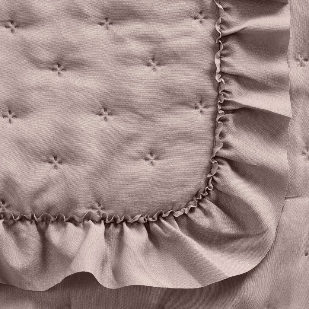 Tkanina měkká na dotek je prošívaná technikou lisování za tepla, která zajišťuje odolný vzor a delší životnost materiálu. Neobvyklý dekor volánků dodá vaší ložnici romantický styl. Lehká a pružná výplň znamená, že přehoz při stlaní postele měkce zakryje postel, a zajistí tak pořádek v ložnici. Šířka: 170 cm, délka: 210 cm, barva: pudrová, hmotnost: 80 GSM, složení: 100 % polyester.Doplňkové parametry