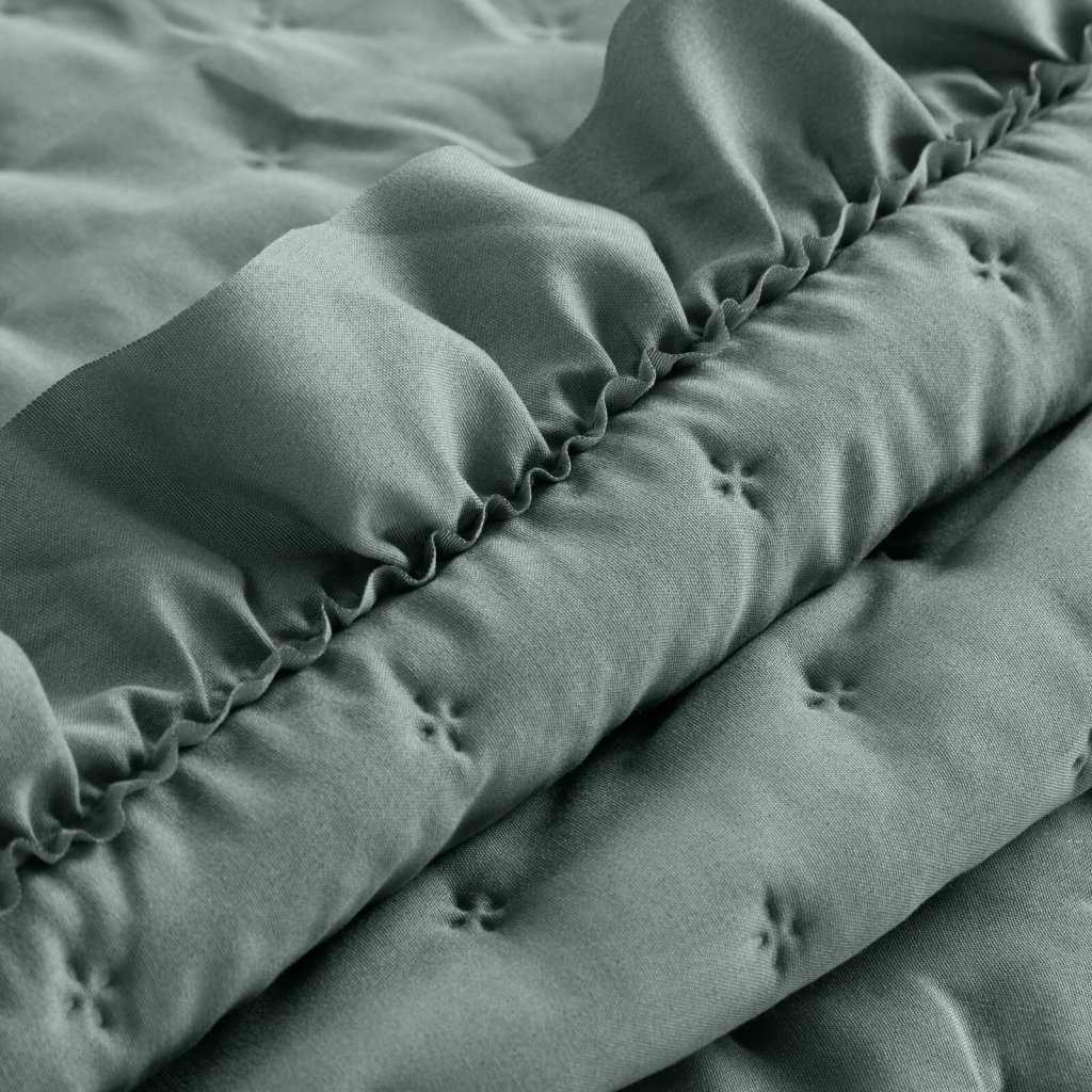 Tkanina měkká na dotek je prošívaná technikou lisování za tepla, která zajišťuje odolný vzor a delší životnost materiálu. Neobvyklý dekor volánků dodá vaší ložnici romantický styl. Lehká a pružná výplň znamená, že přehoz při stlaní postele měkce zakryje postel, a zajistí tak pořádek v ložnici. Šířka: 200 cm, délka: 220 cm, barva: mátová, hmotnost: 80 GSM, složení: 100 % polyester.Doplňkové parametry