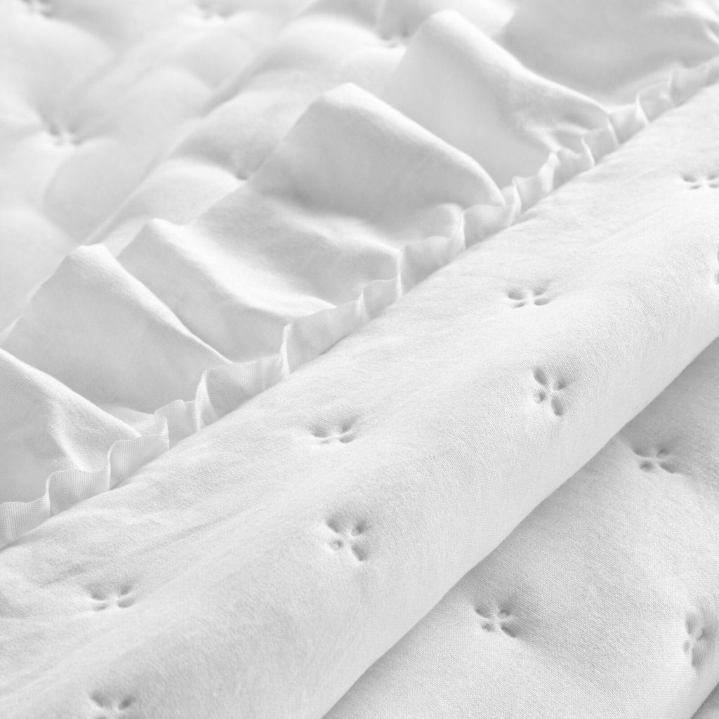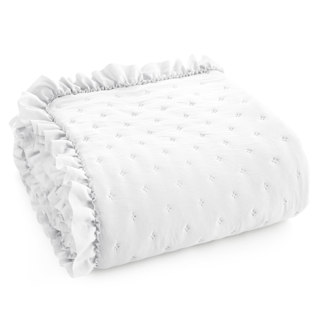 Tkanina měkká na dotek je prošívaná technikou lisování za tepla, která zajišťuje odolný vzor a delší životnost materiálu. Neobvyklý dekor volánků dodá vaší ložnici romantický styl. Lehká a pružná výplň znamená, že přehoz při stlaní postele měkce zakryje postel, a zajistí tak pořádek v ložnici. Šířka: 220 cm, délka: 240 cm, barva: bílá, hmotnost: 80 GSM, složení: 100 % polyester.Doplňkové parametry