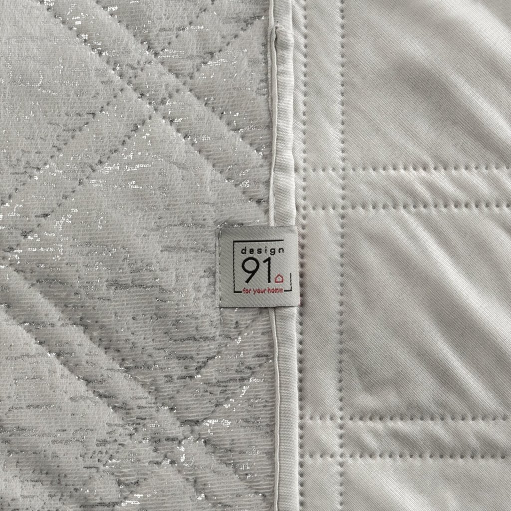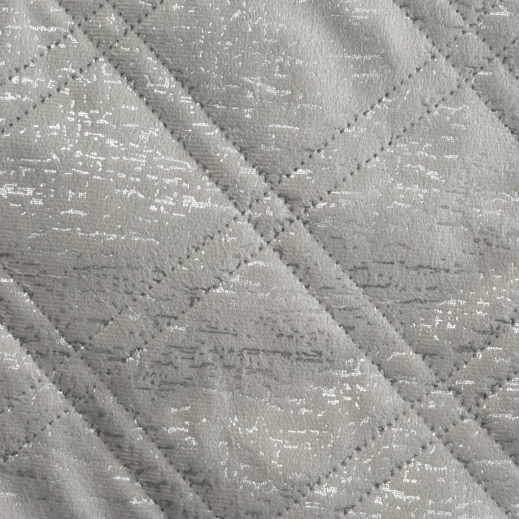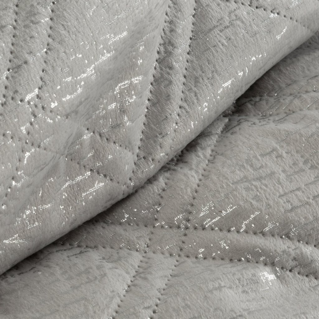 Elegantní sametový přehoz prošívaný moderní metodou hot press, která vytváří jemný kosočtvercový vzor. Přehoz zdobí lesklý, stříbrný, krakelovaný potisk, který má jedinečný, třpytivý efekt. Spodní část přehozu je vyrobena z matné tkaniny, která účinně zabraňuje jeho sklouzávání a zajišťuje stabilitu na posteli nebo pohovce. Šířka: 220 cm, délka: 240 cm, barva: stříbrná, gramáž: 250 GSM, složení: 100% polyester.Doplňkové parametry