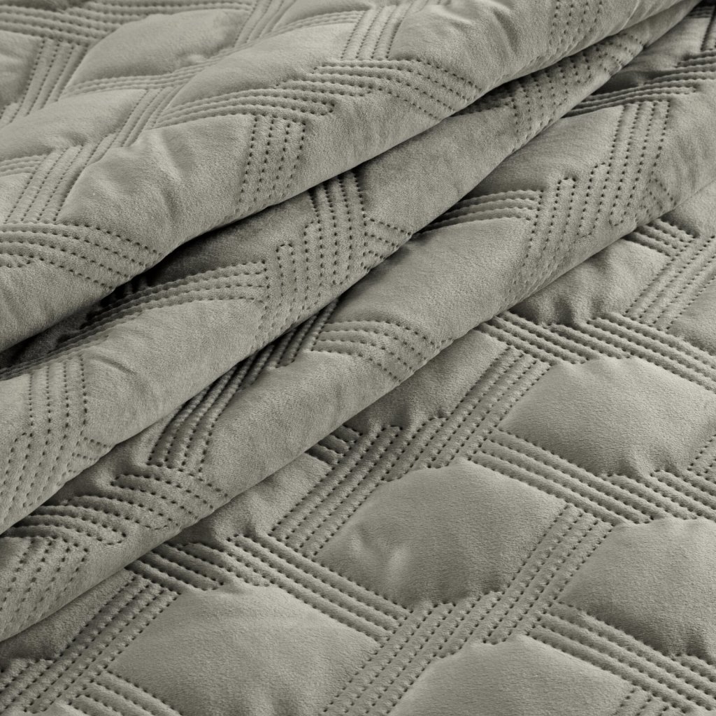 Stylový přehoz na postel z měkké, sametové tkaniny s jemným leskem. Prošívaný moderní metodou hot press, která vytváří elegantní geometrický vzor bez použití tradičních švů. Šířka: 200 cm, délka: 220 cm, barva: stříbrná, gramáž: 250 GSM, složení: 100% polyester.Doplňkové parametry