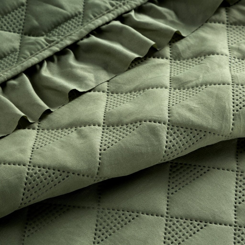 Jednobarevný přehoz na postel vyrobený technikou hot press s volánem po celém obvodu, šířka: 170 cm, délka: 210 cm, barva: světle zelená, hmotnost: 80 GSM, složení: 100% polyester.Doplňkové parametry