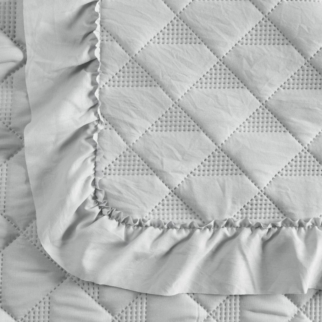 Jednobarevný přehoz na postel vyrobený technikou hot press s volánem po celém obvodu, šířka: 200 cm, délka: 220 cm, barva: stříbrná, hmotnost: 80 GSM, složení: 100% polyester.Doplňkové parametry