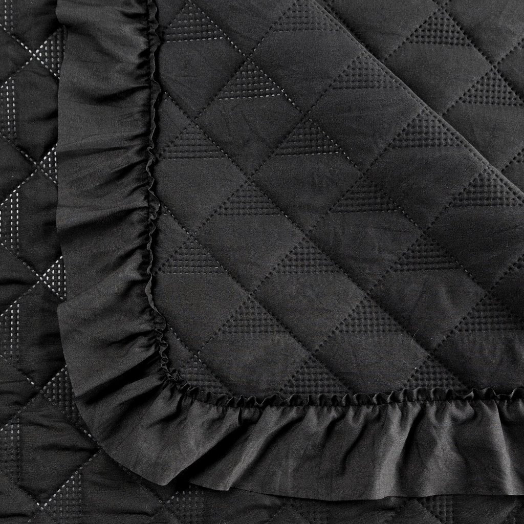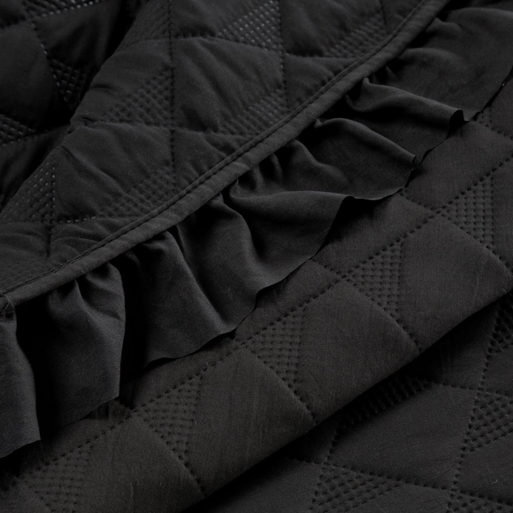 Jednobarevný přehoz na postel vyrobený technikou hot press s volánem po celém obvodu, šířka: 170 cm, délka: 210 cm, barva: černá, hmotnost: 80 GSM, složení: 100% polyester.Doplňkové parametry