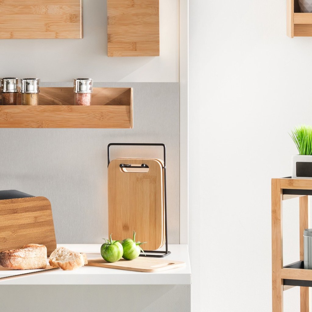 Souprava sestávající ze 4 bambusových desek na krájení a elegantního kovového stojanu. Lze je použít i jako servírovací tác nebo jako kryt kuchyňské desky proti horkému nádobí. Bambusové dřevo, ze kterého jsou desky vyrobeny, rychle schne, neotupuje nože, vypadá hezky a neabsorbuje bakterie. Desky lze použít oboustranně. Jsou lehké, snadno se čistí, odolávají vysokým teplotám a vlhkosti. Kovový stojan, který je součástí soupravy, usnadňuje udržování pořádku a šetří místo. Desky jsou certifikovány a určeny pro styk s potravinami. Praktická souprava, která se bude hodit do každé kuchyně. Nemyjte v myčce na nádobí.Rozměry desky