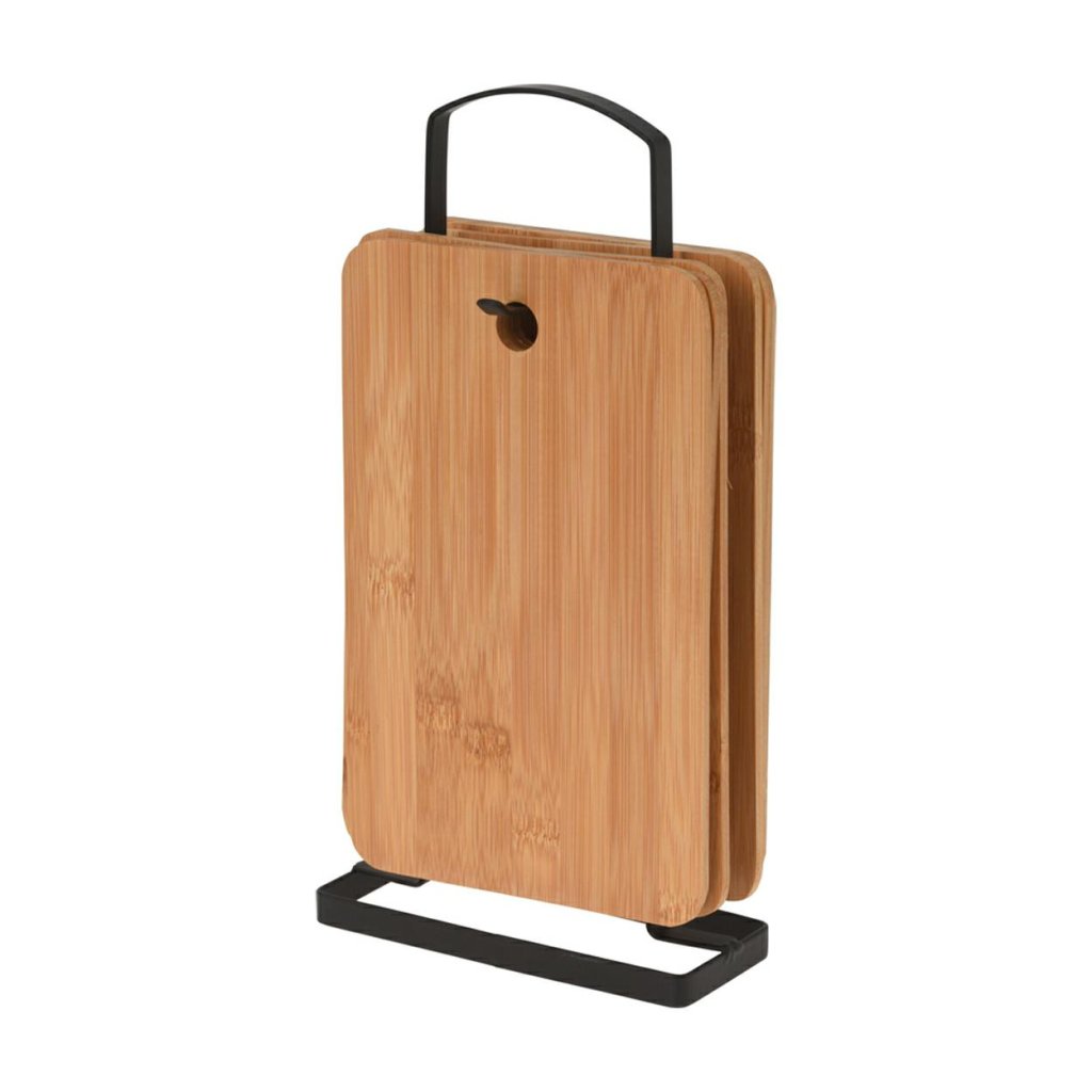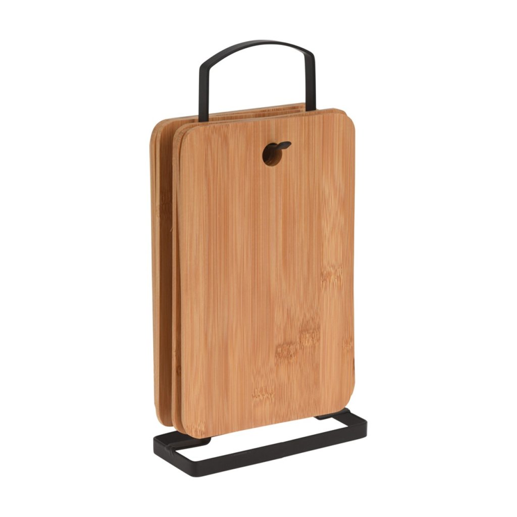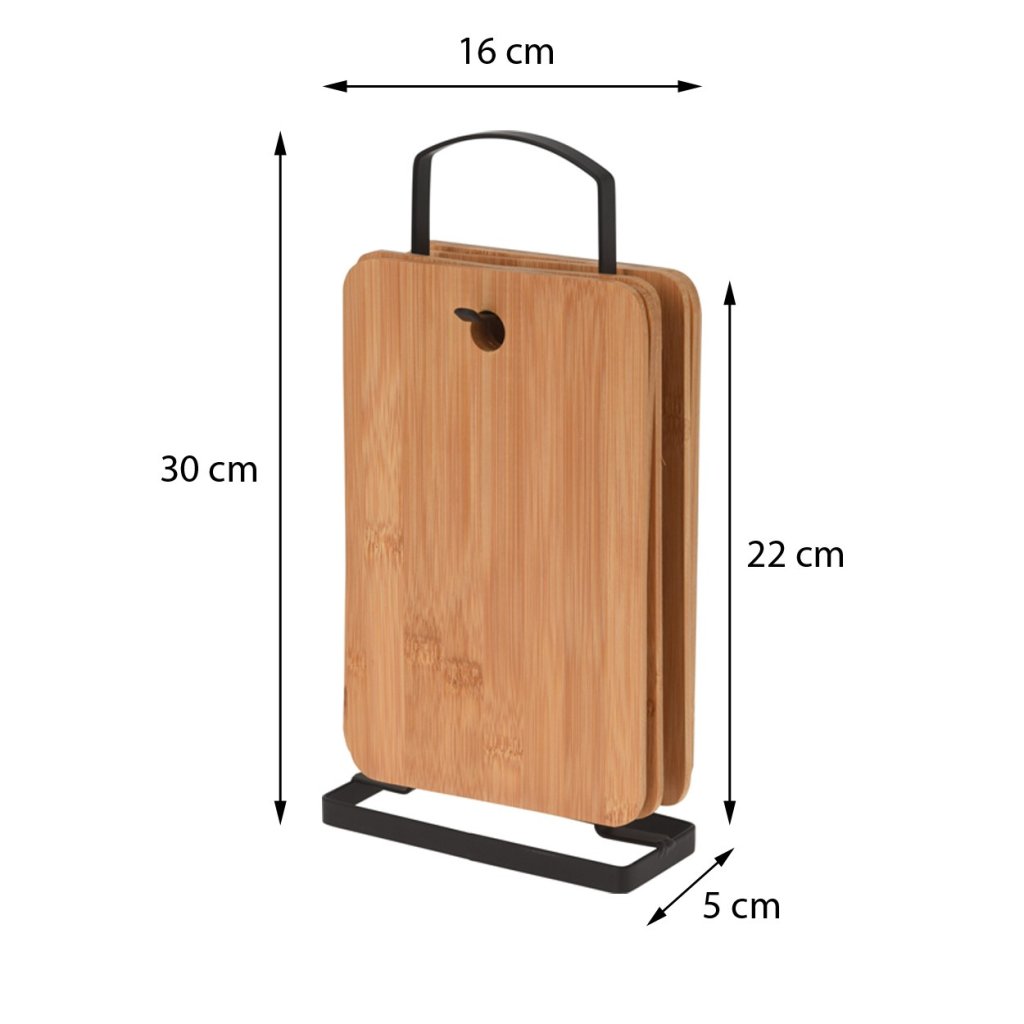 Sada elegantních dřevěných kuchyňských desek vyrobených z bambusu. Desky jsou zavěšeny na černém kovovém stojanu ve stylu Loft. Desky jsou vyrobeny z bambusového dřeva, což je obrovská výhoda a je prospěšné pro naše zdraví. Podle nejnovějších výzkumů specialisté doporučují desky z materiálů jako dub, bambus a buk. Mají rychleschnoucí vlastnosti, neztupují nože, vypadají velmi pěkně a hlavně absorbují nejmenší množství bakterií.Rozměr jedné desky: 22x14 cm