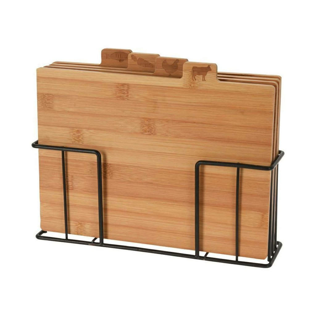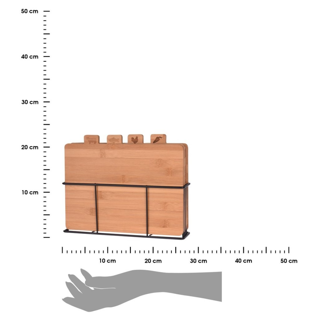 Sada dřevěných kuchyňských desek z bambusu umístěných na černém kovovém stojanu. Každá deska má své vlastní označení. Sada obsahuje desku na maso, drůbež, ryby a zeleninu. Desky jsou vyrobeny z bambusového dřeva, které je prospěšné pro naše zdraví. Podle nejnovějších výzkumů specialisté doporučují desky z materiálů jako dub, bambus a buk. Mají rychleschnoucí vlastnosti, neotupují nože, vypadají hezky a hlavně absorbují nejmenší množství bakterií.Rozměry stojanu: 29x7x12 cm