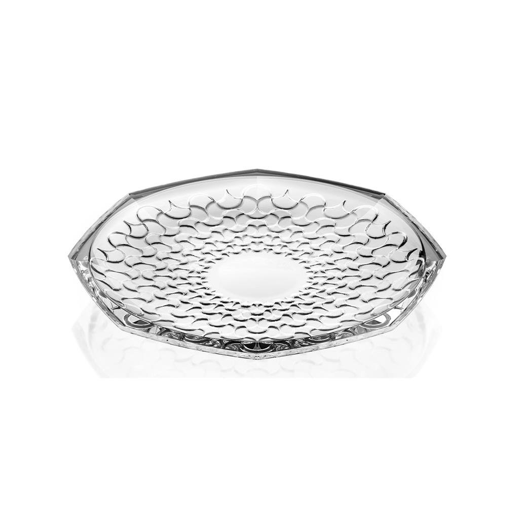 Křišťálový podnos RCR Arabesque je vyroben z vysoce kvalitního křišťálového skla Luxion , které je ekologické a zcela recyklovatelné . Průhledné křišťálové sklo značky RCR se vyznačuje výjimečnou čistotou a elegantním leskem. Podnos o výšce 24 mm a průměru 300 mm je skvělým doplňkem prostřeného stolu. Může být použit jako dekorativní podnos na různá aranžmá nebo na servírování ovoce, pečiva či jiných lahůdek.