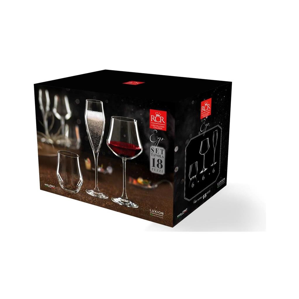 Sada sklenic RCR Ego – černá edice v sobě spojuje moderní estetiku, křišťálovou čistotu a ekologické zpracování . Všechny sklenice jsou vyrobeny z bezolovnatého křišťálového skla Luxion® , které se vyznačuje vysokou čirostí, výrazným leskem a příjemným zvukem při přípitcích. Jedná se o sklo šetrné k přírodě – 100% recyklovatelné . Sada obsahuje šest sklenic na víno nebo vodu o objemu 200 ml a výšce 200 mm , šest sklenic na šampaňské o objemu 180 ml a výšce 230 mm a šest sklenic na whisky o objemu 380 ml a výšce 95 mm . Elegantní design a praktické rozměry dělají z této sady ideální doplněk pro každodenní používání i slavnostní chvíle. Černá edice RCR Ego je výjimečnou volbou jako dárek na svatbu, výročí či narozeniny – pro každého, kdo oceňuje spojení stylu, kvality a udržitelnosti .Doplňkové parametry