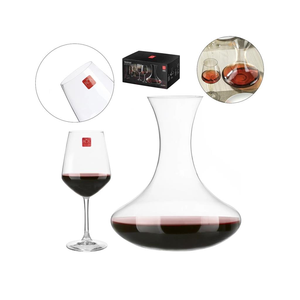 Sada na víno z kolekce RCR Universum představuje elegantní řešení pro každého milovníka vína, který ocení dokonalé spojení funkčnosti, estetiky a špičkové kvality . V balení se nachází karafa o objemu 2000 ml a výšce 23 cm a šest sklenic o objemu 550 ml, výšce 22 cm a průměru 9,6 cm , ideálních pro servírování červeného, bílého i šumivého vína , ale i aperitivů, koktejlů či řemeslného piva. Všechny prvky soupravy jsou vyrobeny z ekologického křišťálového skla Luxion® , které se vyznačuje křišťálovou čirostí, intenzivním leskem a zvýšenou odolností vůči matování a mechanickému poškození. Tento inovativní materiál je zcela bezolovnatý, zdravotně nezávadný a 100% recyklovatelný . Sklenice mají promyšlený tvar, který usměrňuje optimální množství nalévaného vína a zajišťuje pohodlné každodenní používání . Celá souprava byla vyrobena v srdci Toskánska , regionu známého staletou tradicí sklářského řemesla.Doplňkové parametry