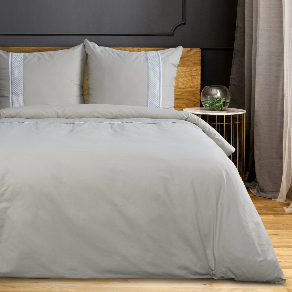 Ložní souprava REINA z měkké, prodyšné bavlny renforcé, zdobená jemným vyšívaným vzorem, který jí dodává elegantní a moderní charakter. Výšivka jemně zvýrazňuje strukturu ložního prádla a dodává mu stylový vzhled, který se bude skvěle hodit do různých interiérů. Šířka: 220 cm, délka: 200 cm, povlak na polštář 2 ks 70x80 cm, barva: šedá, gramáž: 115 GSM, složení: 100% bavlna.Doplňkové parametry
