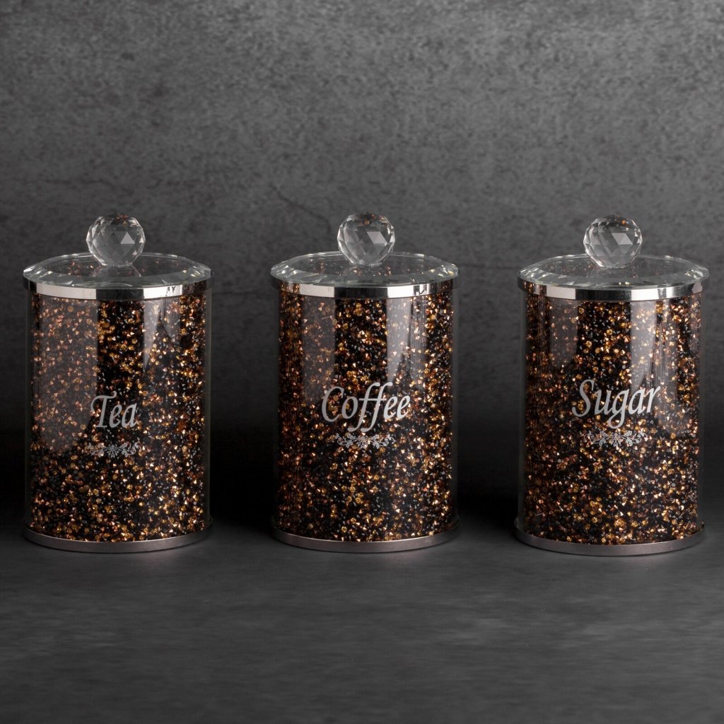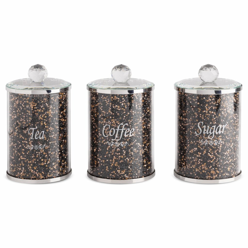 SADA 3KS NÁDOB NA ČAJ, CUKR A KÁVU POKRYTÁ KŘISTALIKY 10x10x17 CM ČERNÁ/ZLATÁ