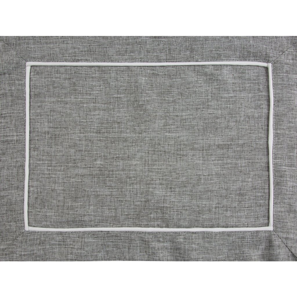 Ubrus zdobený bordurou, sada obsahuje 4 ubrusy v jednom balení, šířka: 40 cm, délka: 30 cm, barva: šedá a bílá, složení: 100% polyester.Doplňkové parametry