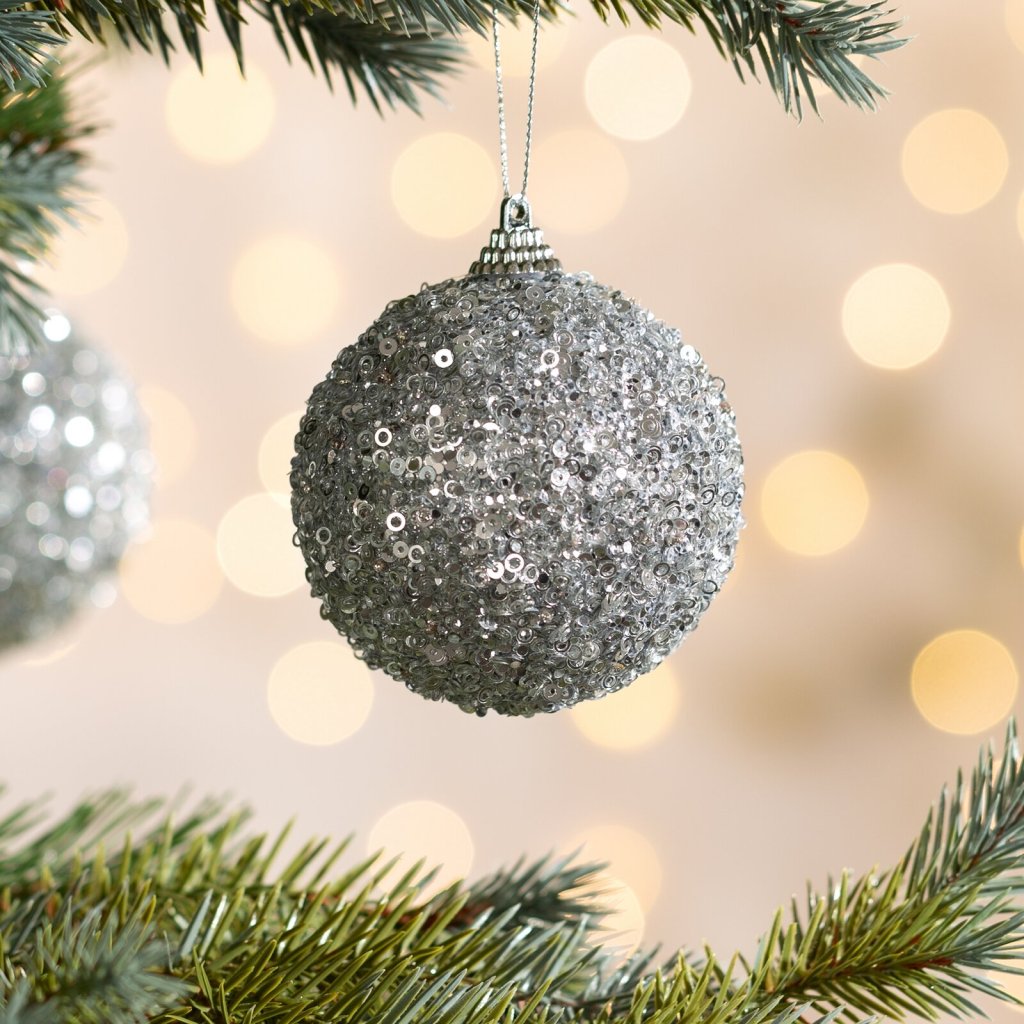 Plastový ornament zdobený malými flitry, barva: stříbrná, složení: 100% polyesterDoplňkové parametry