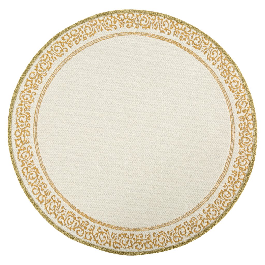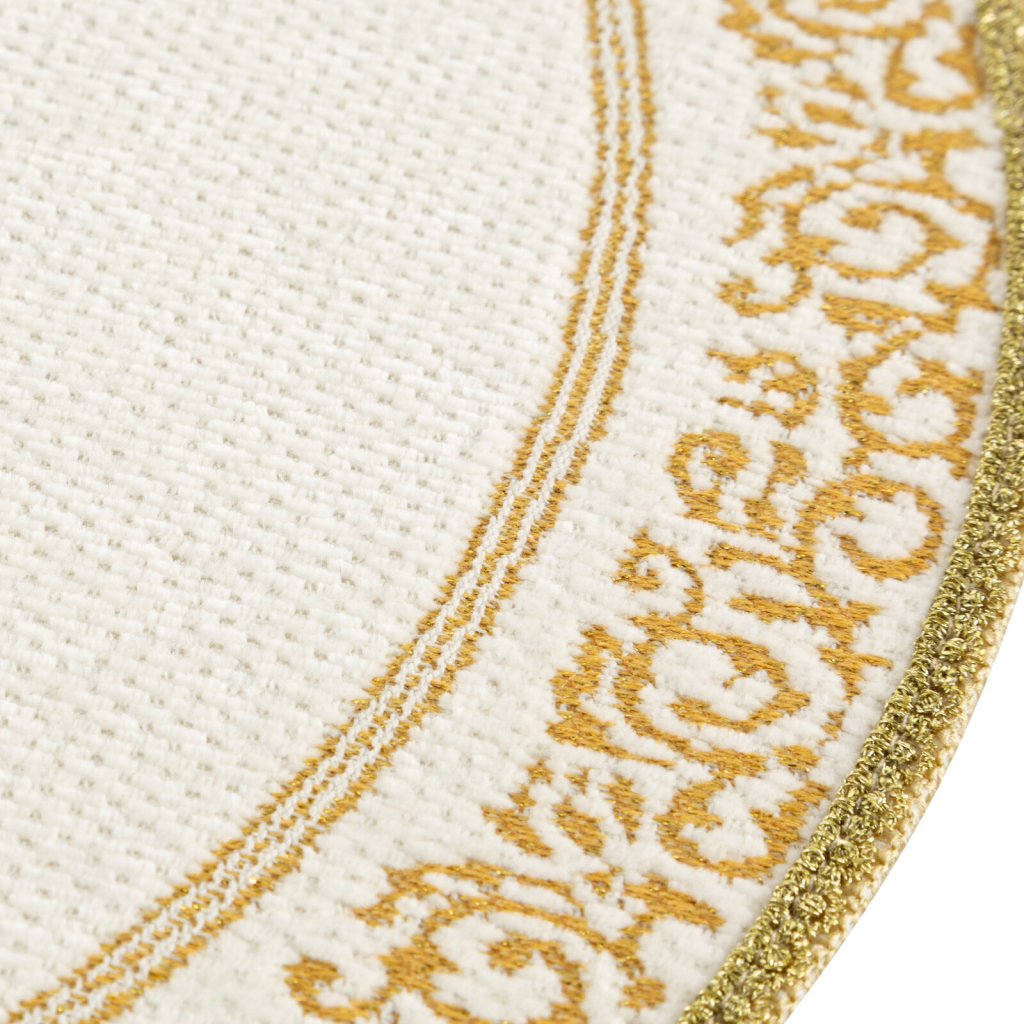 Krémový dekorační ubrus se zlatým dekorem, šířka: 30 cm, délka: 50 cm, barva: krémová a zlatá, hmotnost: 500 GSM, složení: 75 % polyester, 24 % viskóza, 1 % kovová nit.Doplňkové parametry