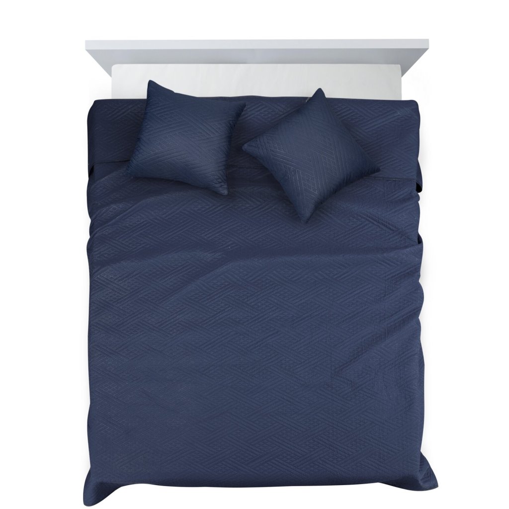 Tento elegantní přehoz BONI v syté barvě okamžitě rozzáří každou ložnici. Jeho povrch zdobí jemný geometrický prošívaný vzor, který vznikl díky technice hot press. Přehoz je vyroben z příjemného a kvalitního materiálu, který je měkký na dotek a zároveň odolný pro každodenní použití. Součástí balení jsou také dva odpovídající povlaky na polštáře o rozměrech 40 × 40 cm, které vytvářejí dokonale sladěný vzhled. Šířka: 200 cm, délka: 220 cm, barva: tmavě modrá, gramáž: 70+120 GSM, složení: 100% polyester.Doplňkové parametry