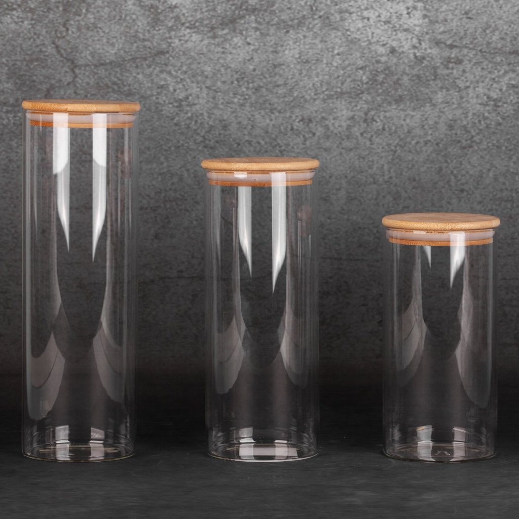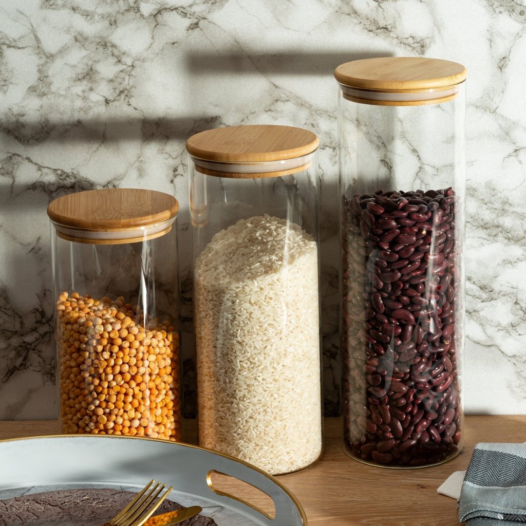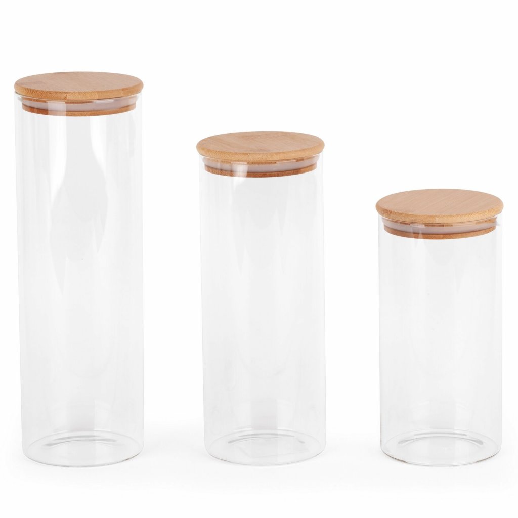 Sada skleněných dóz, barva: čirá, složení: 70 % sklo; 30 % dřevo.Doplňkové parametry