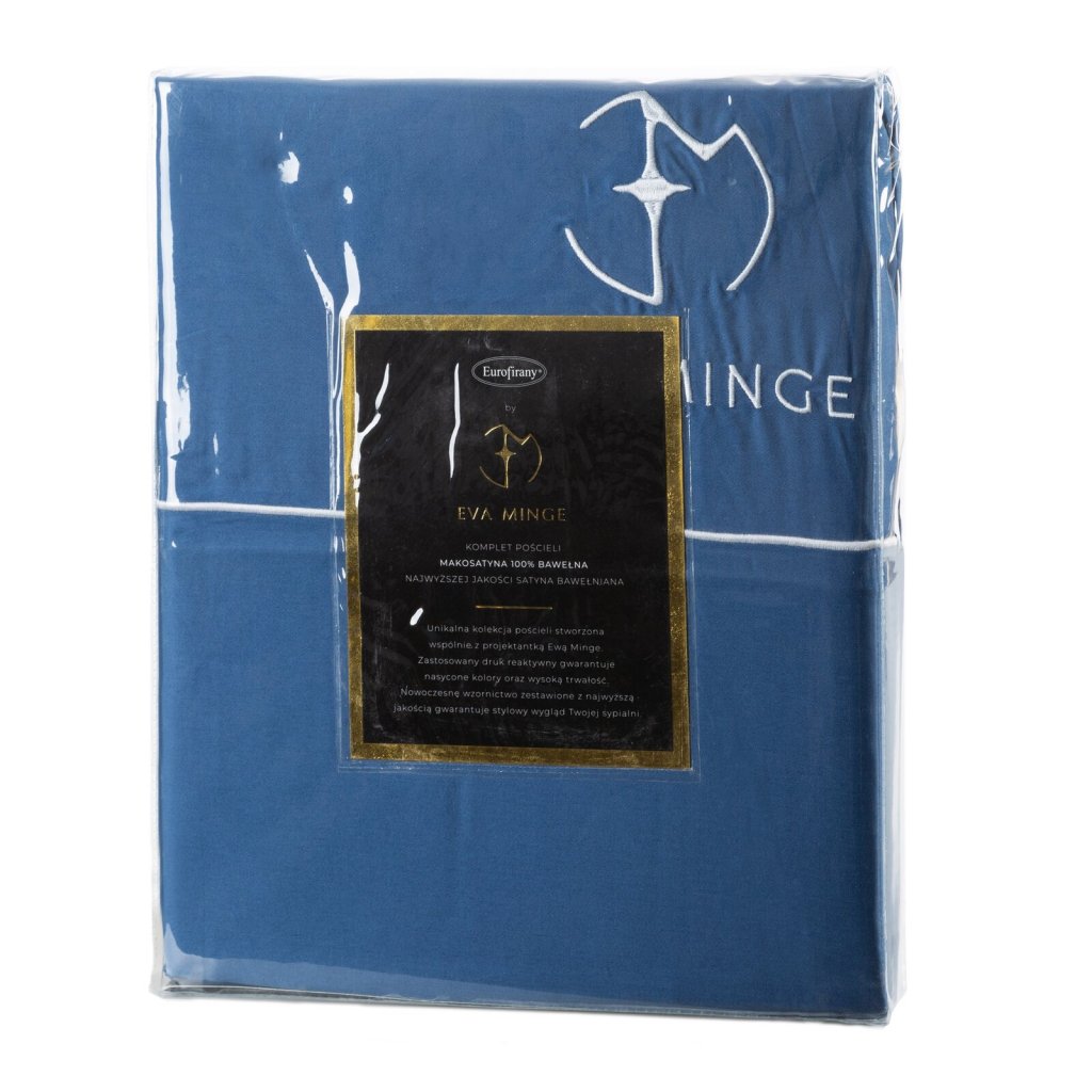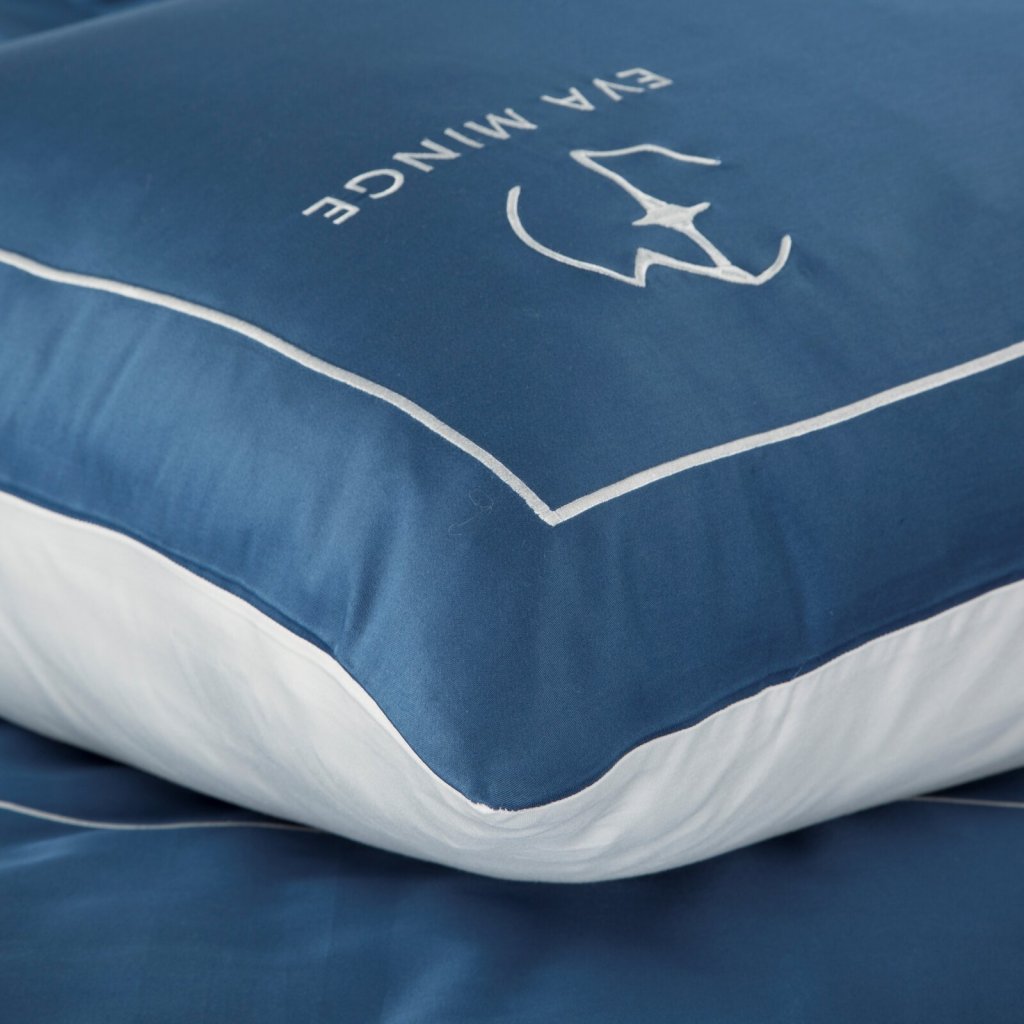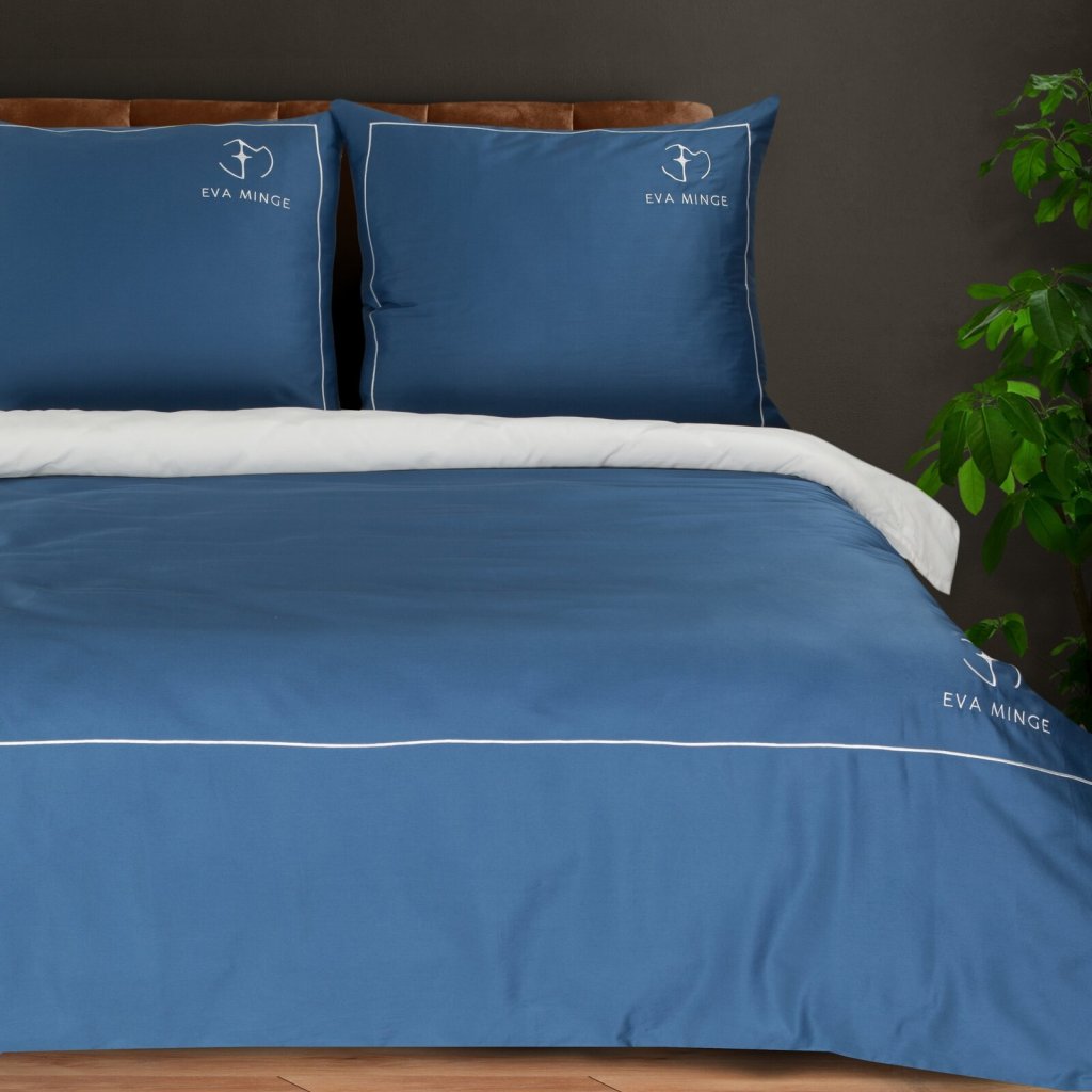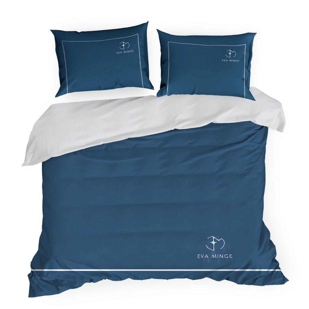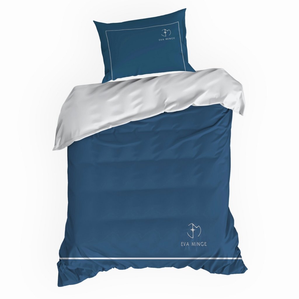 Sada exkluzivního designového povlečení z bavlněného saténu z kolekce Eva Minge. Zapínání na zip a precizní zpracování. Barva: modrá a bílá, gramáž: 125 GSM, šířka: 220 cm, délka: 200 cm, 2 ks povlaků na polštář 70x80 cm, složení: 100% bavlna.Doplňkové parametry