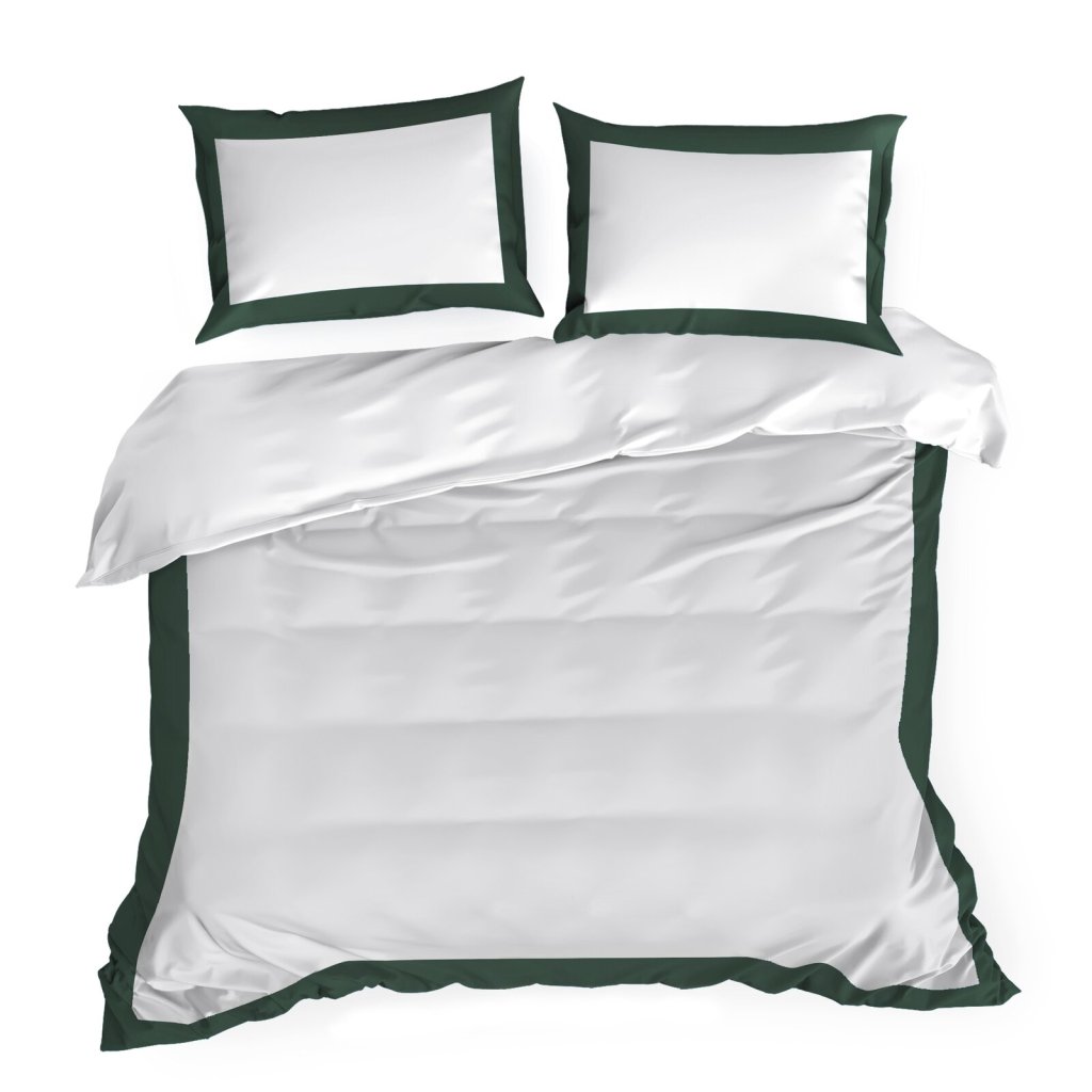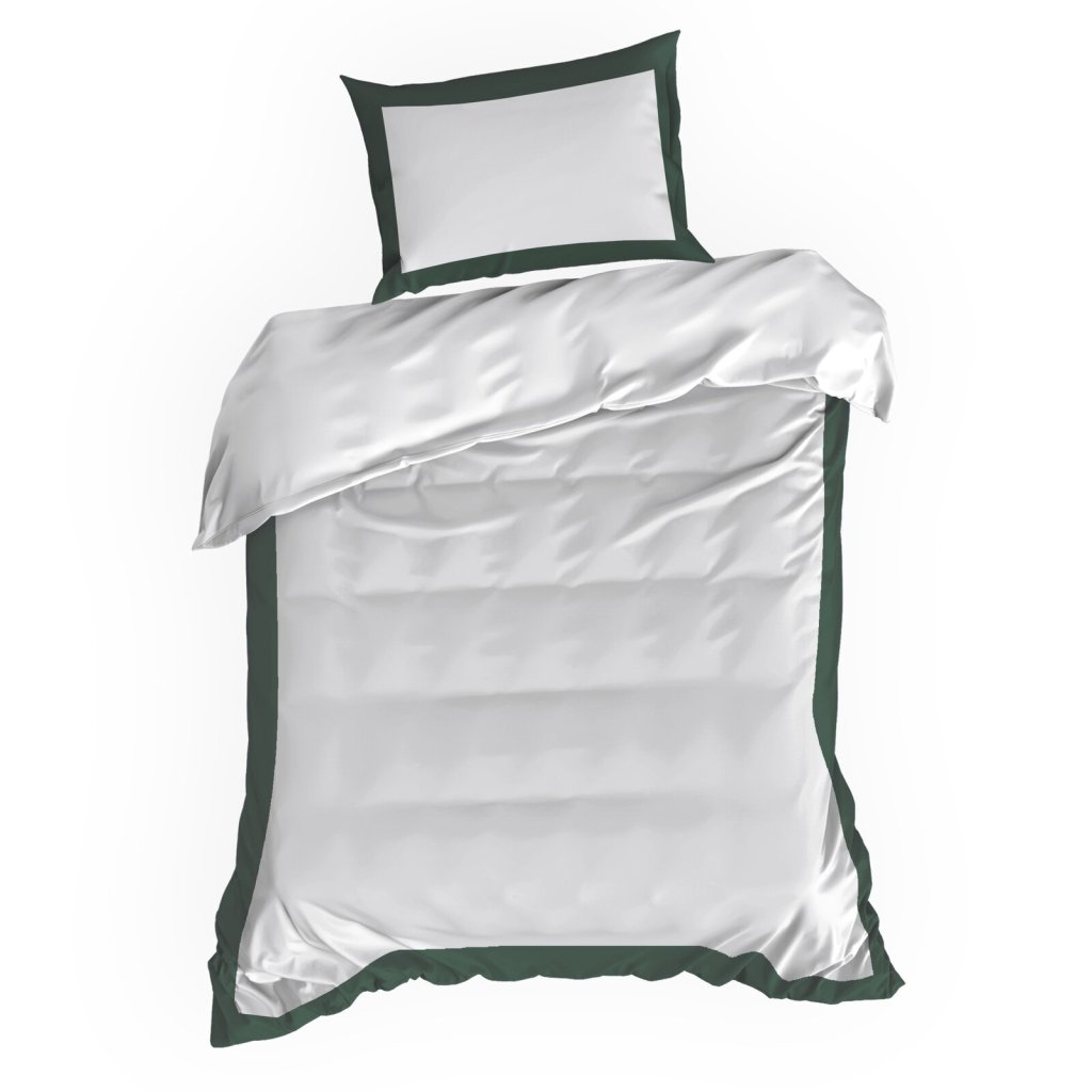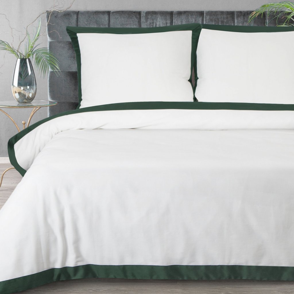 Saténové bavlněné povlečení s ozdobným barevným lemem, šířka: 160 cm, délka: 200 cm, povlaky na polštář: 2 ks 70x80 cm, barva: bílá a zelená, hmotnost: 125 GSM, složení: 55 % bavlna, 45 % polyester.Doplňkové parametry