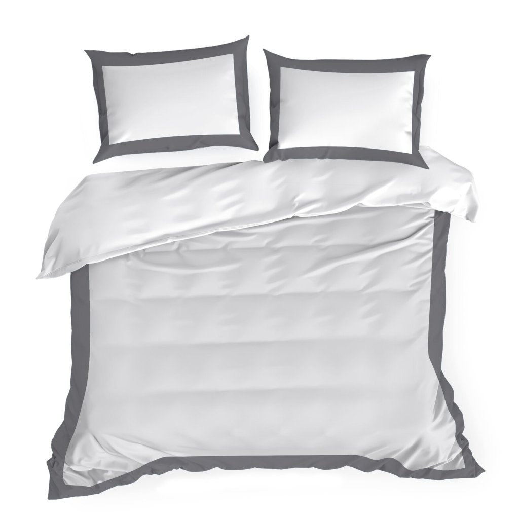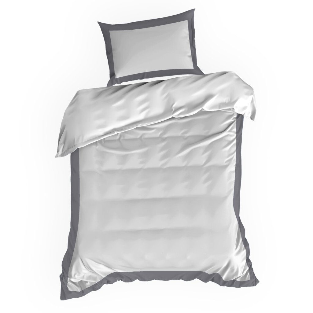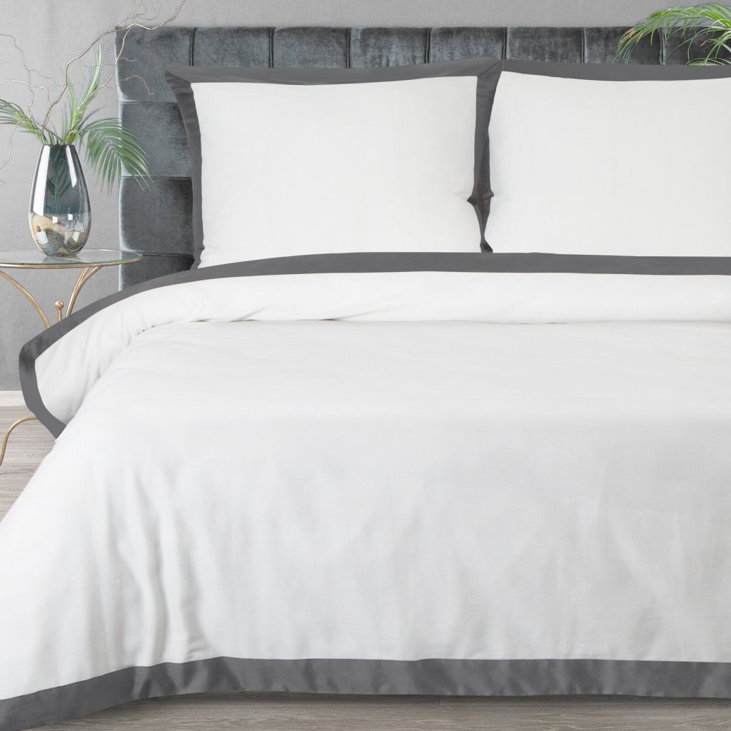 Saténové bavlněné povlečení s ozdobným barevným lemem, šířka: 160 cm, délka: 200 cm, povlaky na polštář: 2 ks 70x80 cm, barva: bílá a šedá, gramáž: 125 GSM, složení: 55 % bavlna, 45 % polyester.Doplňkové parametry