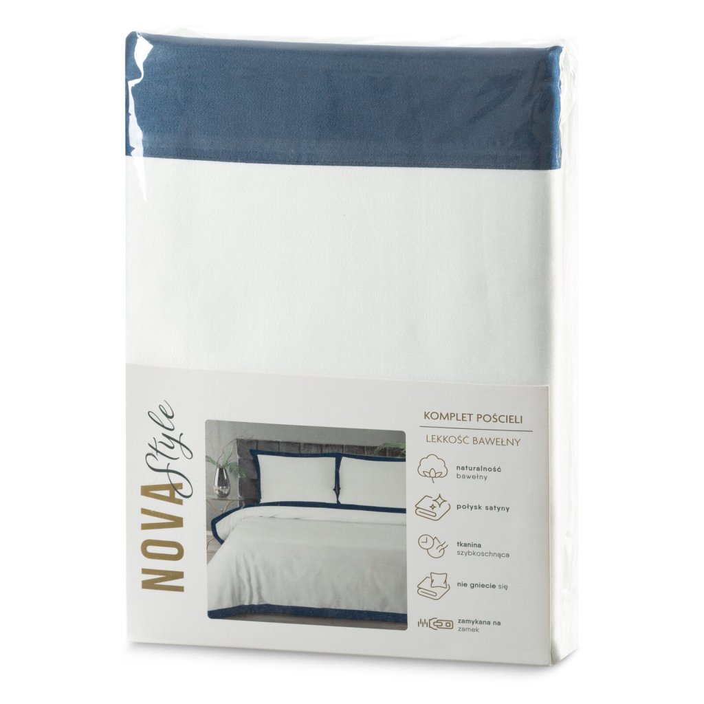 Saténové bavlněné povlečení s ozdobným barevným lemem, šířka: 160 cm, délka: 200 cm, povlaky na polštář: 2 ks 70x80 cm, barva: bílá a modrá, hmotnost: 125 GSM, složení: 55 % bavlna, 45 % polyester.Doplňkové parametry