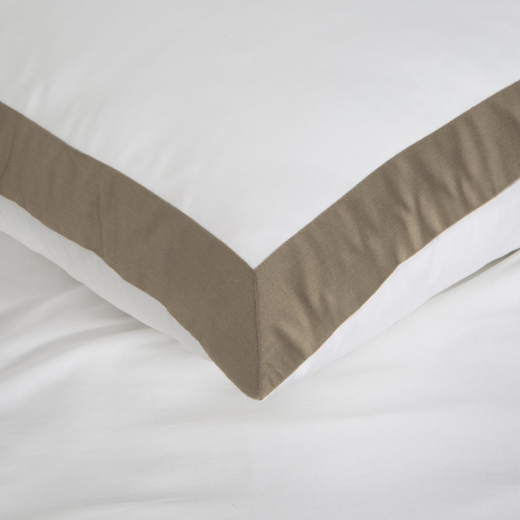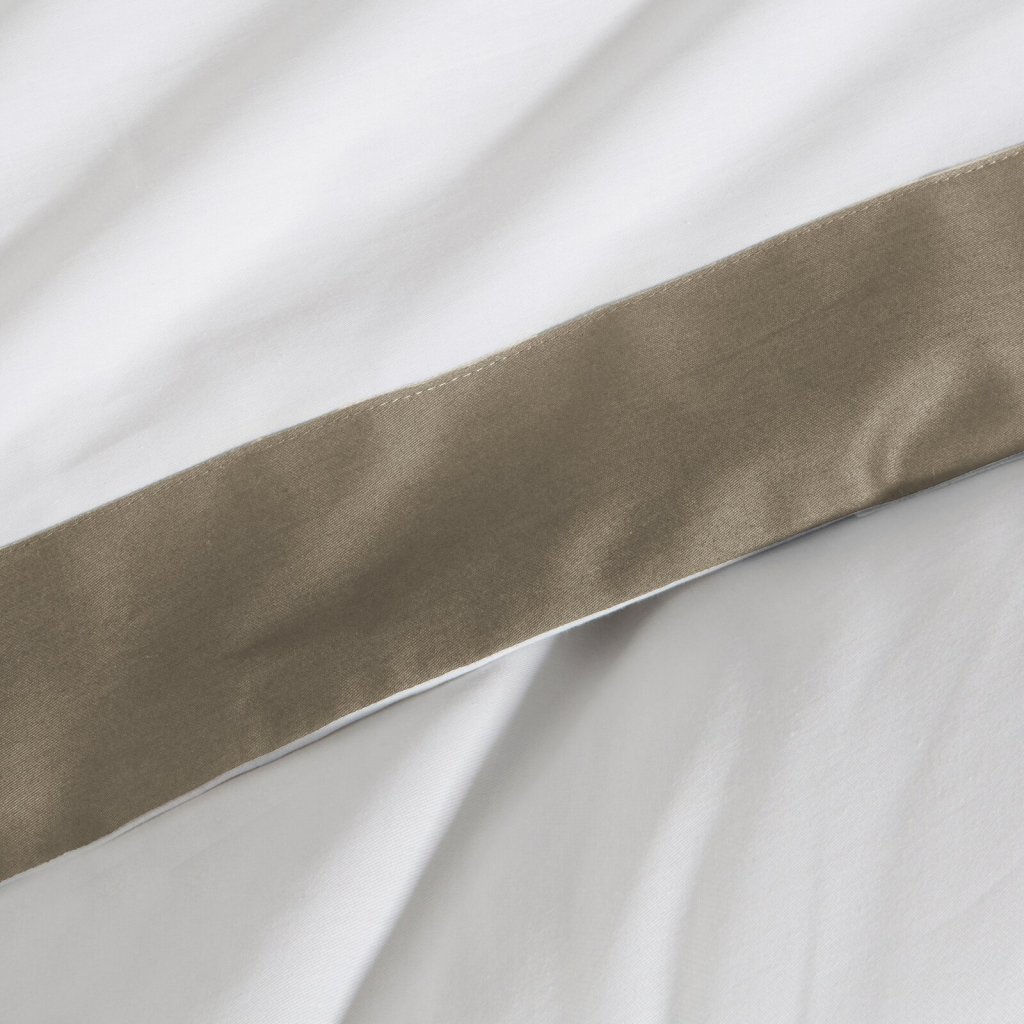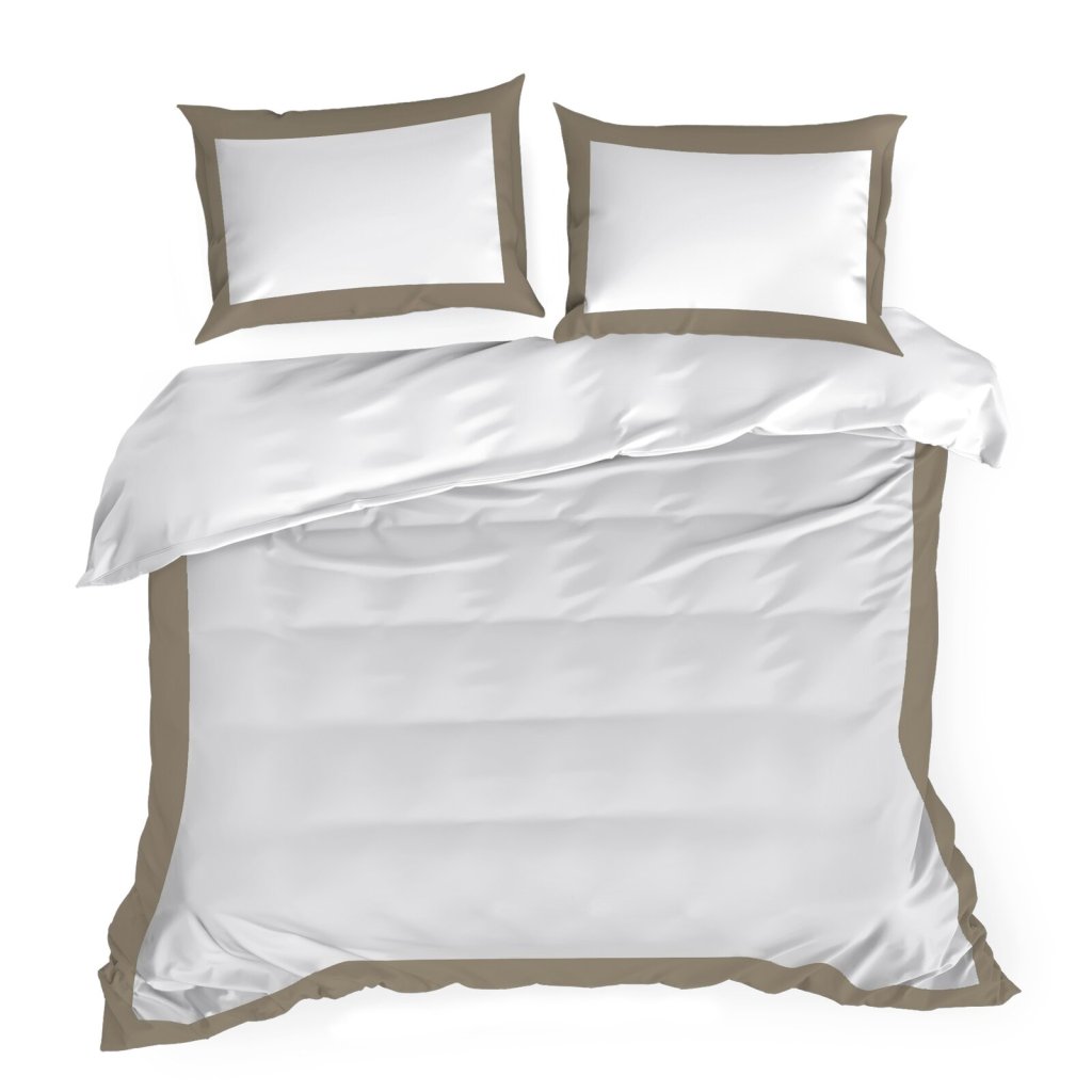 Saténové bavlněné povlečení s ozdobným barevným lemem, šířka: 220 cm, délka: 200 cm, povlaky na polštář: 2 ks 70x80 cm, barva: bílá a tmavě béžová, hmotnost: 125 GSM, složení: 55 % bavlna, 45 % polyester.Doplňkové parametry