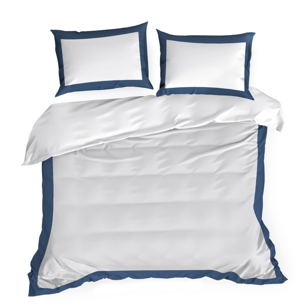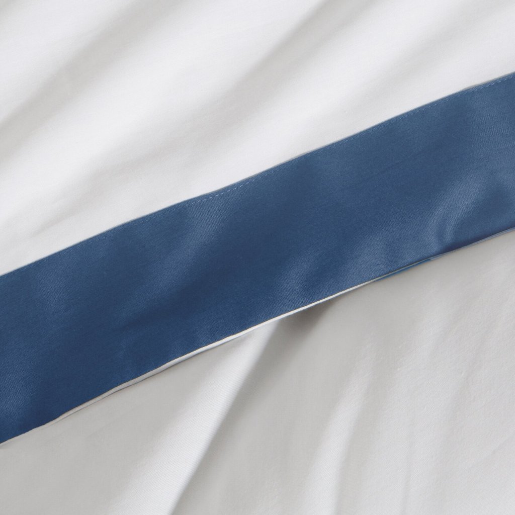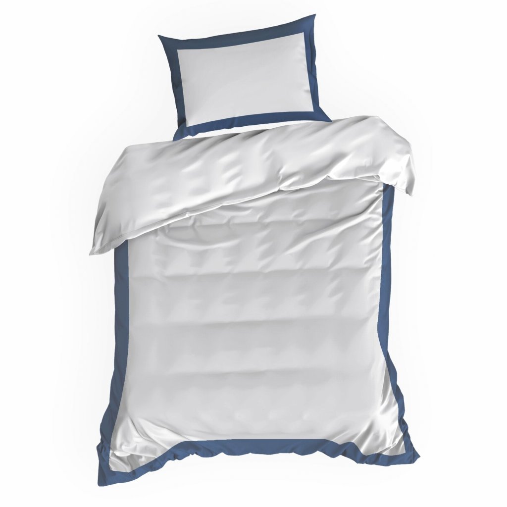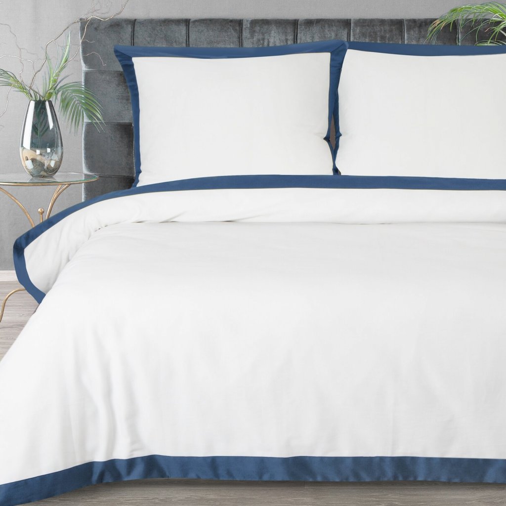 Saténové bavlněné povlaky na polštáře s ozdobným barevným lemem, šířka: 220 cm, délka: 200 cm, povlaky na polštáře: 2 ks 70x80 cm, barva: bílá a modrá, hmotnost: 125 GSM, složení: 55 % bavlna, 45 % polyester.Doplňkové parametry